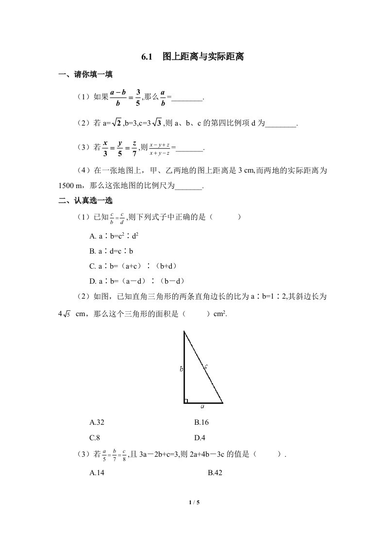 6.1图上距离与实际距离一、请你填一填(1)如果=b=3,那么“=b-51b(2)若a=√2,b-3,c=3√3,则a、b、c的第四比例项d为(3)若=’=名,则=+357x+y-z(4)在一张地图上,甲、乙两地的图上距离是3Cm,而两地的实际距离为1500m,那么这张地图的比例尺为二、认真选一选(1)已知,则下列式子中正确的是()A.a b=c2 d2B.a d=c:bC.a:b=(a+c):(b+d)D.a b=(a-d):(b-d)(2)如图,已知直角三角形的两条直角边长的比为a:b=1:2,其斜边长为45cm,那么这个三角形的面积是()cm2.A.32B.16C.8D.4(3)若号号台,且3a-2b+c3,则2a+4b-3c的值是(),A.14B.42115