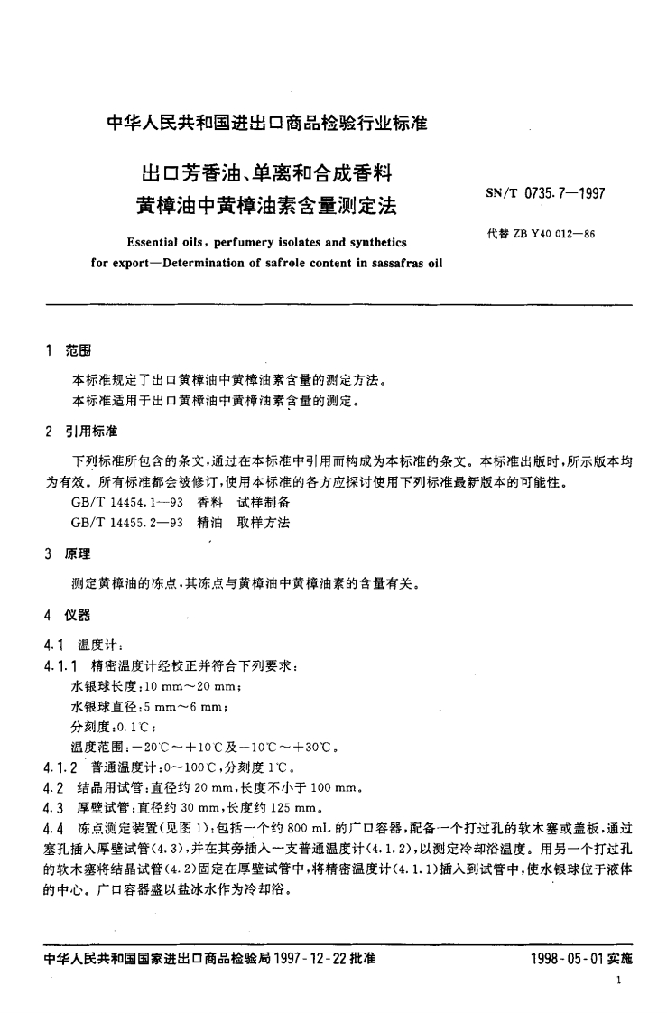 SN_T0735.7-1997出口芳香油、单离和合成香料黄樟油中黄樟油素含量标准测定法348072@abc1个月前发布关注私信98.80KB5页021SN_T0735.7-1997出口芳香油、单离和合成香料黄樟油中黄樟油素含量标准测定法此内容为付费资源,请付费后查看¥13¥19黄金会员免费钻石会员免费立即购买您当前未登录!建议登陆后购买,可保存购买订单付费资源 第1页 / 共5页 第2页 / 共5页 第3页 / 共5页 第4页 / 共5页 第5页 / 共5页 已完成全部阅读,共5页 THE END农学类标准规范餐饮美食 喜欢就支持一下吧收藏