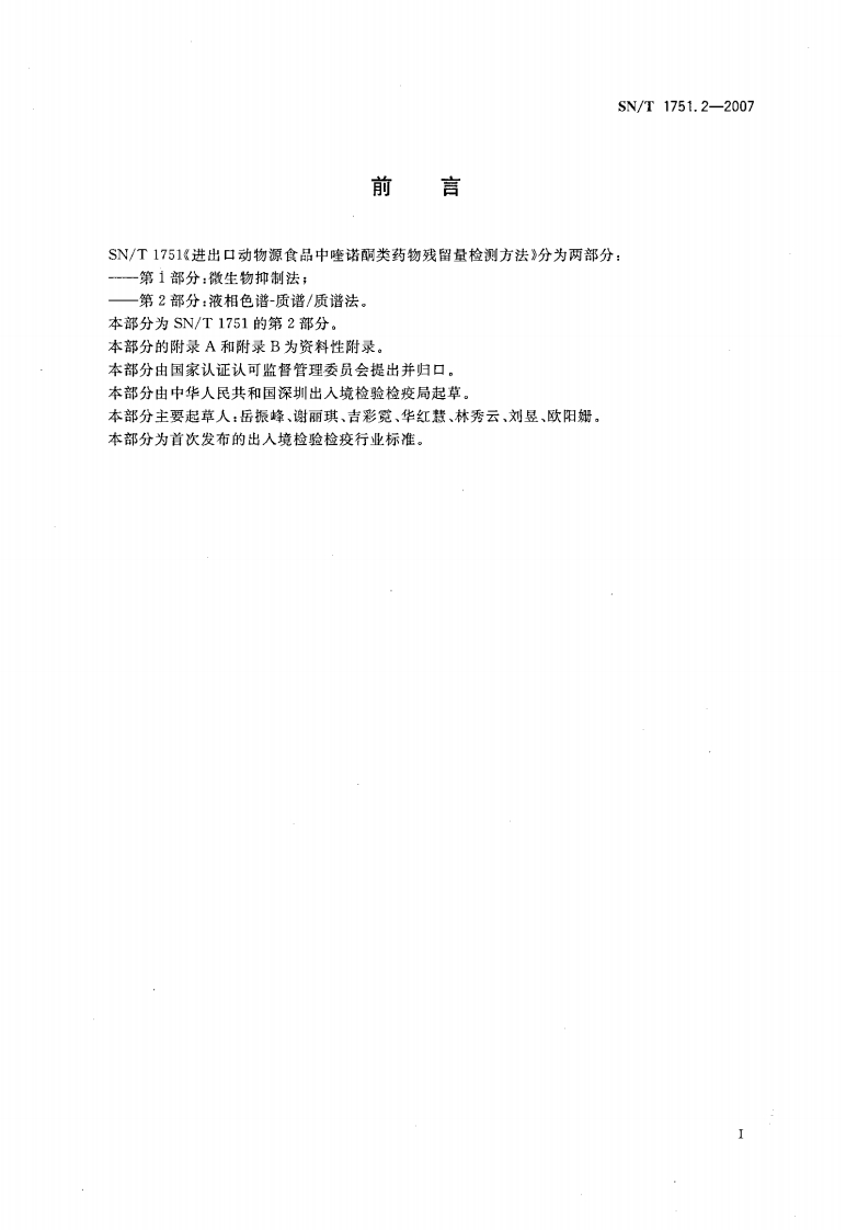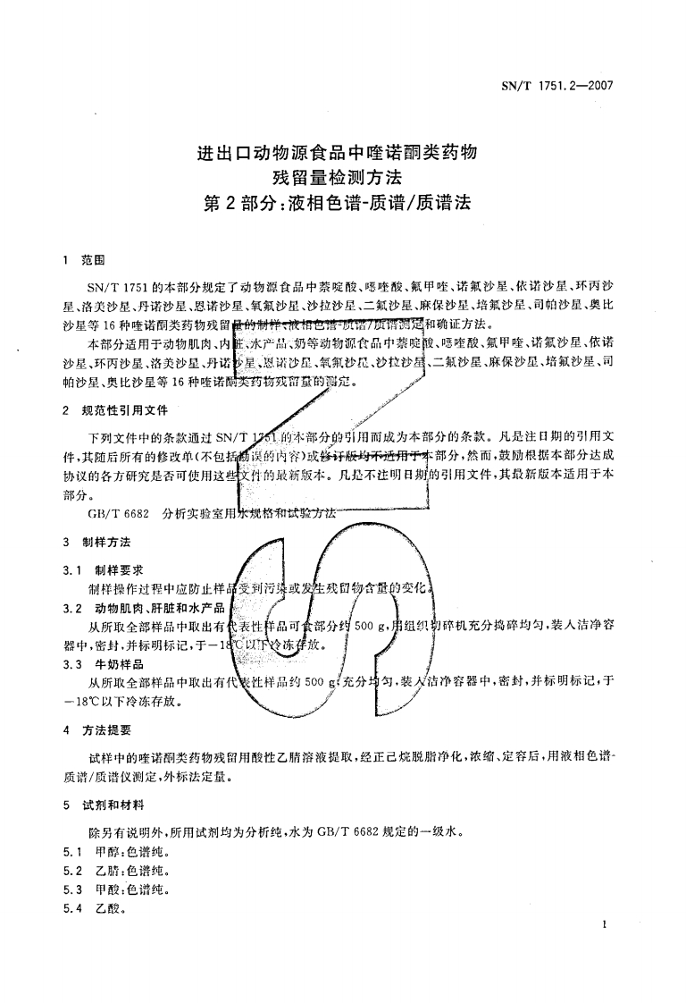 SN_T1751.2-2007进出口动物源食品中喹诺酮类药物残留量检测标准方法第2部分:液相色谱-质谱_质谱法348072@abc1个月前发布关注私信0.60MB24页036SN_T1751.2-2007进出口动物源食品中喹诺酮类药物残留量检测标准方法第2部分:液相色谱-质谱_质谱法此内容为付费资源,请付费后查看¥11¥19黄金会员免费钻石会员免费立即购买您当前未登录!建议登陆后购买,可保存购买订单付费资源 第1页 / 共24页 第2页 / 共24页 第3页 / 共24页 第4页 / 共24页 第5页 / 共24页 试读已结束,还剩19页,您可下载完整版后进行离线阅读 THE END农学类标准规范餐饮美食 喜欢就支持一下吧收藏