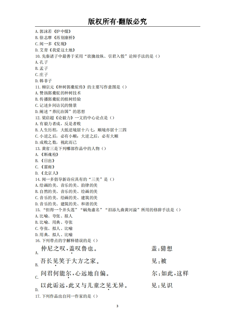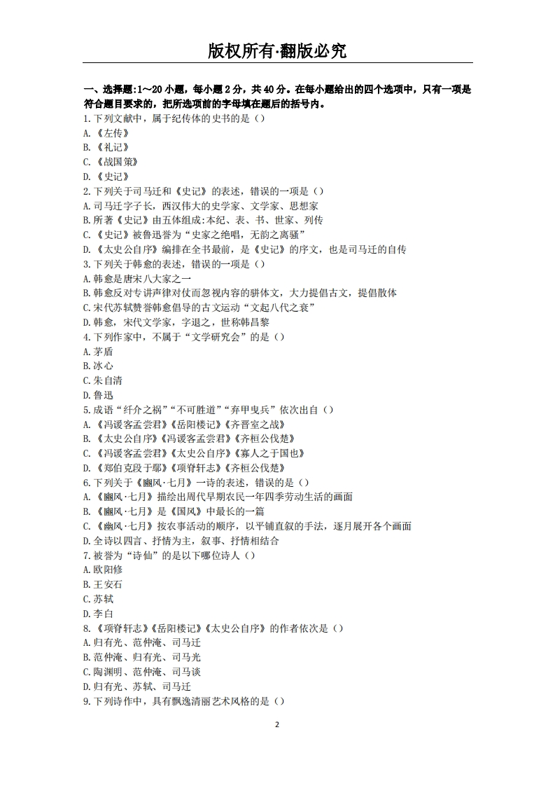 专科起点升本科《大学语文》必考练习题试题348072@abc1个月前发布关注私信0.69MB9页050专科起点升本科《大学语文》必考练习题试题此内容为付费资源,请付费后查看¥19¥23黄金会员免费钻石会员免费立即购买您当前未登录!建议登陆后购买,可保存购买订单付费资源 第1页 / 共9页 第2页 / 共9页 第3页 / 共9页 第4页 / 共9页 试读已结束,还剩5页,您可下载完整版后进行离线阅读 THE END党政宣传初中教育历史学类员工培训哲学类教育学类法学类管理学类规章制度高考真题 喜欢就支持一下吧收藏