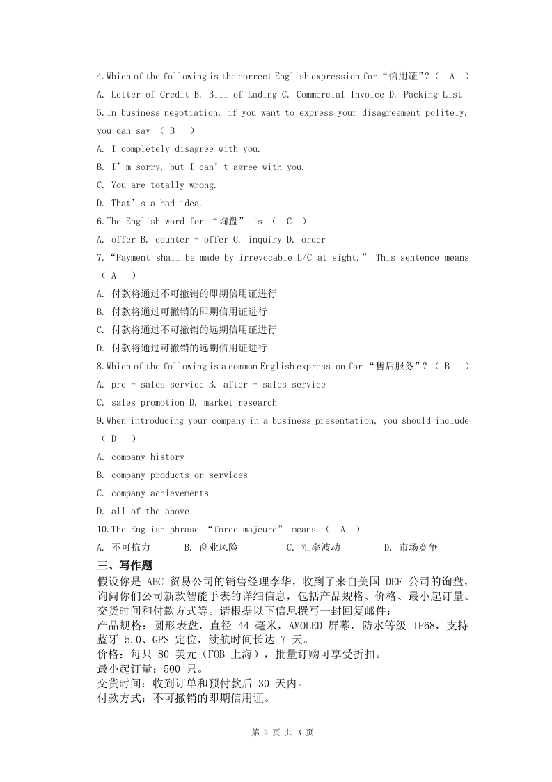 商务英语备考练习试题(2)348072@abc1个月前发布关注私信33.50KB3页029商务英语备考练习试题(2)此内容为付费资源,请付费后查看¥19¥23黄金会员免费钻石会员免费立即购买您当前未登录!建议登陆后购买,可保存购买订单付费资源 第1页 / 共3页 第2页 / 共3页 第3页 / 共3页 已完成全部阅读,共3页 THE END党政宣传初中教育员工培训工控机电打印机电焊机规章制度车辆音响数码高考真题 喜欢就支持一下吧收藏