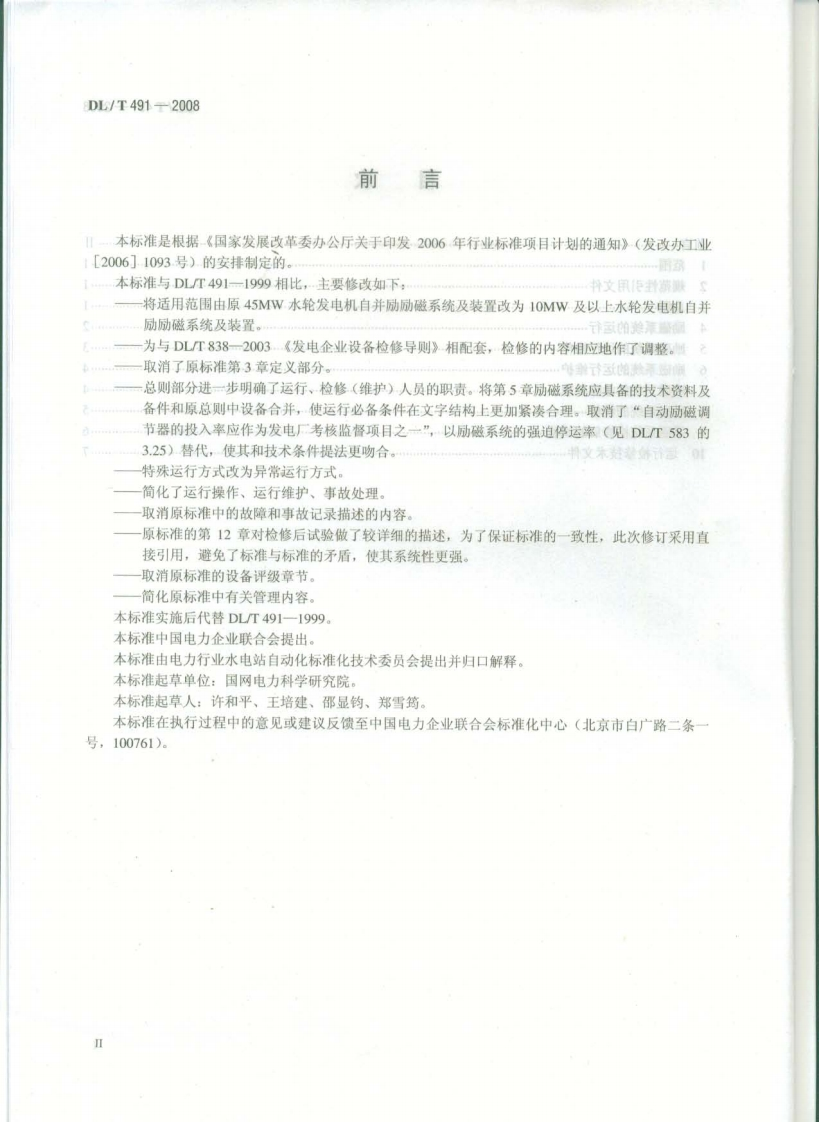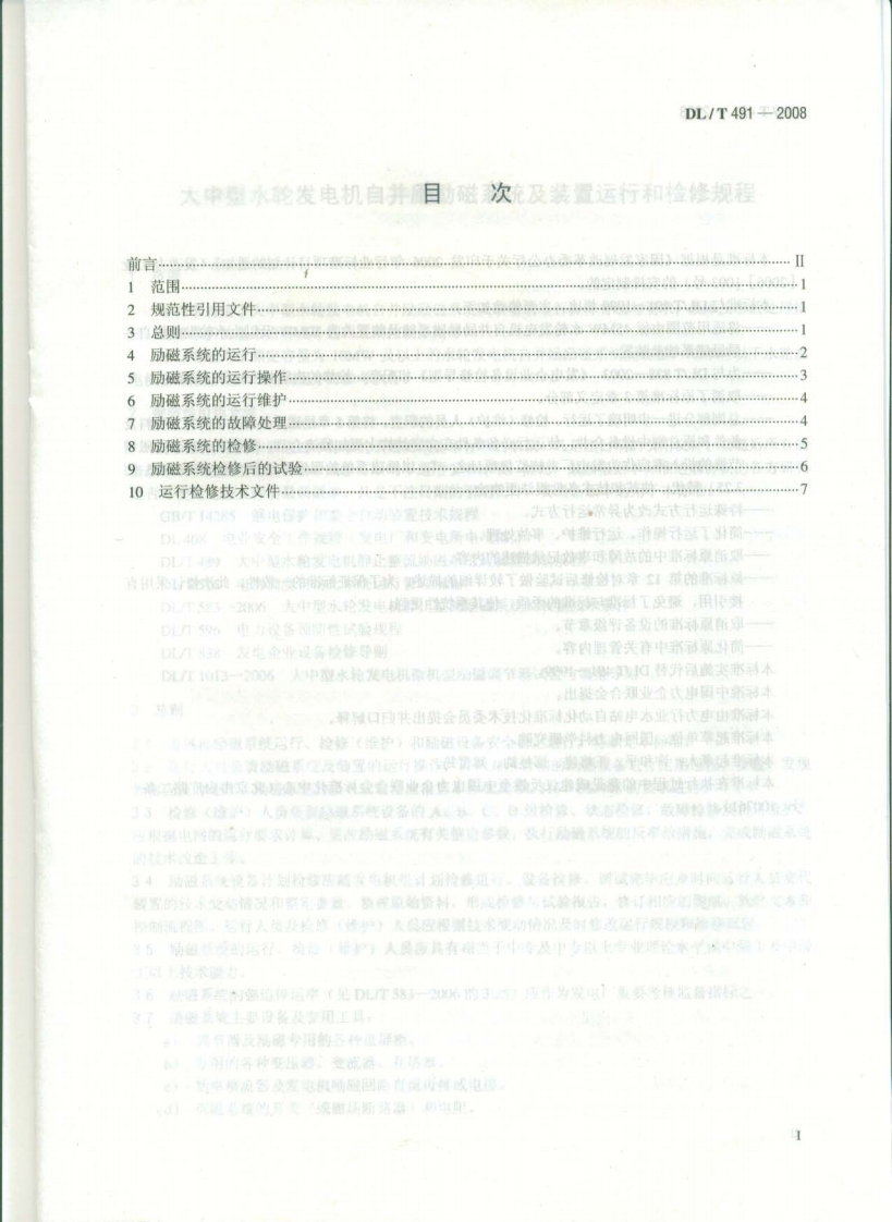 ICS27.100F23备案号:24172-2008DL中华人民共和国电力行业标准DL/T491-2008代替DL/T491一1999大中型水轮发电机自并励励磁系统及装置运行和检修规程Code for operating and overhauling of self-shung exciction systemequipment of large and medium-sized hydraulic generator2008-06-04发布2008-11-01实施中华人民共和国国家发展和改革委员会发布