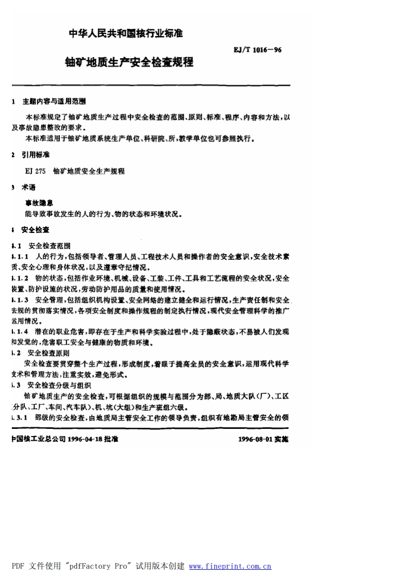 E、中华人民共和国核行业标准EJ_T1016-96铀矿地质生产安全检查规程348072@abc12天前发布关注私信0.34MB12页034E、中华人民共和国核行业标准EJ_T1016-96铀矿地质生产安全检查规程此内容为付费资源,请付费后查看¥19¥23黄金会员免费钻石会员免费立即购买您当前未登录!建议登陆后购买,可保存购买订单付费资源 第1页 / 共12页 第2页 / 共12页 第3页 / 共12页 试读已结束,还剩9页,您可下载完整版后进行离线阅读 THE END标准规范餐饮美食 文本预览 EJ中华人民共和国核行业标准EJ/T1016-96铀矿地质生产安全检查规程1996-0418发布1996-08-01实施中国核工业总公司发布PDF文件使用"pdfFactory Pro”试用版本创建ww.fineprint.com.cn 查看更多 收起部分 喜欢就支持一下吧收藏