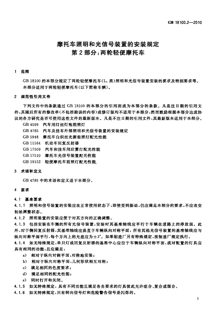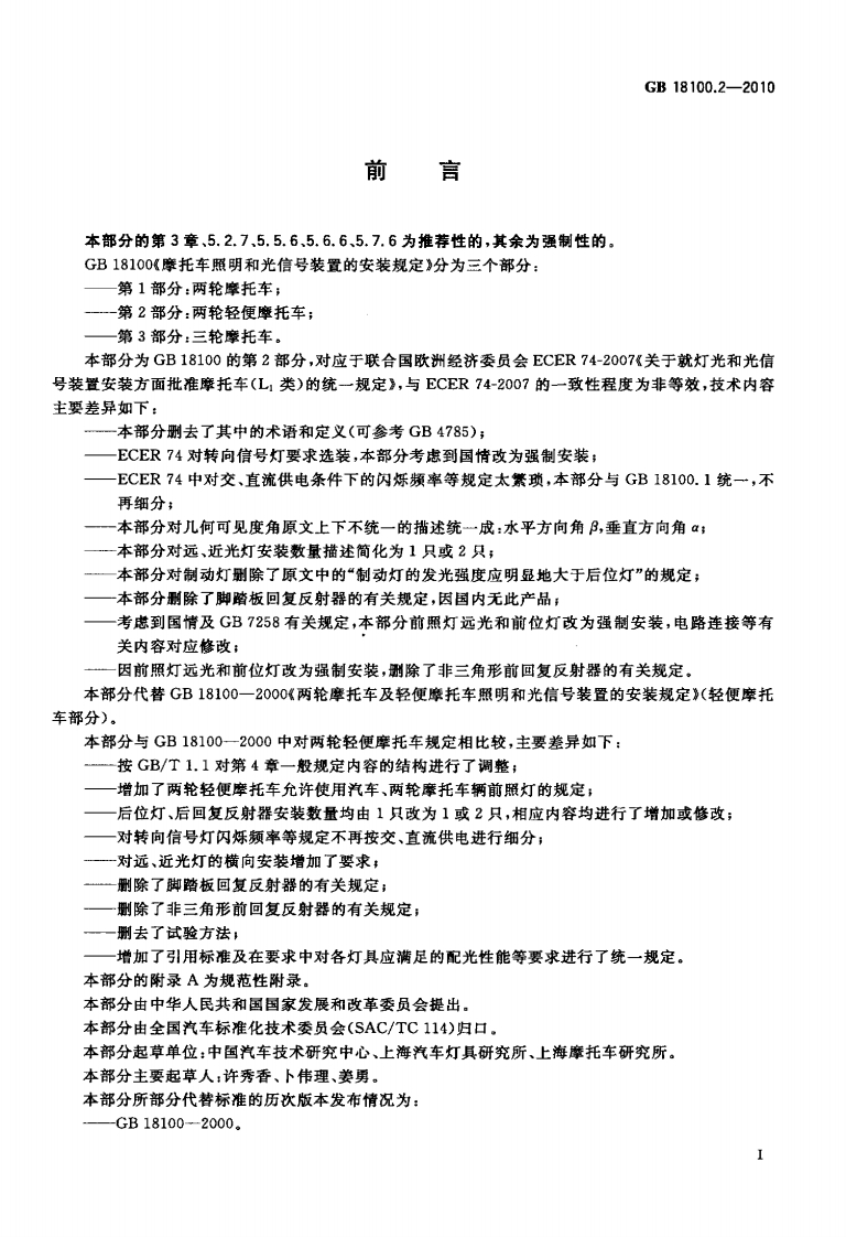 1CS43.040.20T38中华人民共和国国家标准GB18100.2—2010部分代替GB18100一2000摩托车照明和光信号装置的安装规定第2部分:两轮轻便摩托车Provisions for installation of lighting and light-signalling devices for motorcycles-Part 2:Two wheels moped2011-01-10发布2012-01-01实施中华人民共和国国家质量监督检验检疫总局中国国家标准化管理委员会发布