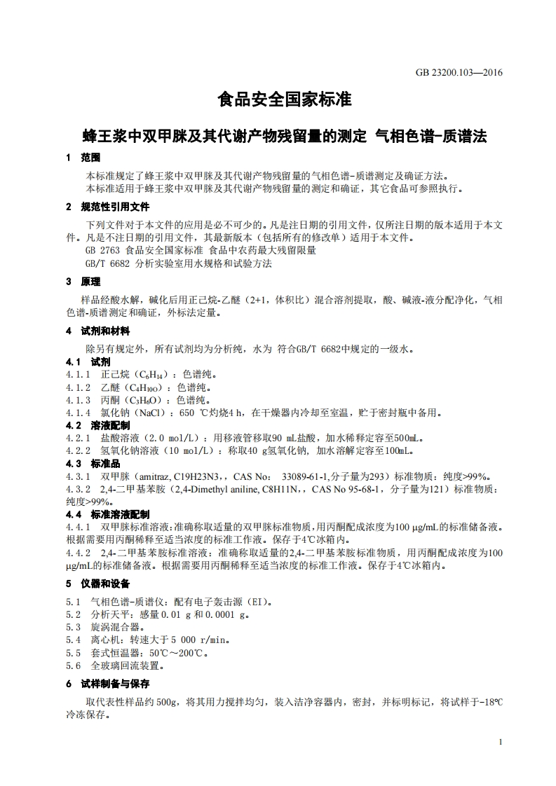 ICS点击此处添加ICS号点击此处添加中国标准文献分类号GB中华人民共和国国家标准GB23200.103-2016代替SN/T2574-2010食品安全国家标准蜂王浆中双甲脒及其代谢产物残留量的测定气相色谱-质谱法National food safety standards-Determination of amitraz and its metabolites residues in royal jellyGas chromatography -mass spectrometry2016-12-18发布2017-06-18实施中华人民共和国国家卫生和计划生育委员会中华人民共和国农业部发布国家食品药品监督管理总局
