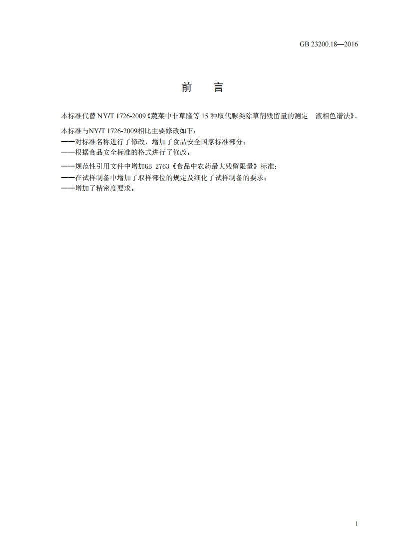 ICS点击此处添加ICS号点击此处添加中国标准文献分类号GB中华人民共和国国家标准GB23200.18-2016代替NYT1726—2009食品安全国家标准蔬菜中非草隆等15种取代脲类除草剂残留量的测定液相色谱法National food safety standards-Determination of 15 substituted urea herbicides in vegetablesLiquid chromatography2016-12-18发布2017-06-18实施中华人民共和国国家卫生和计划生育委员会中华人民共和国农业部发布国家食品药品监督管理总局