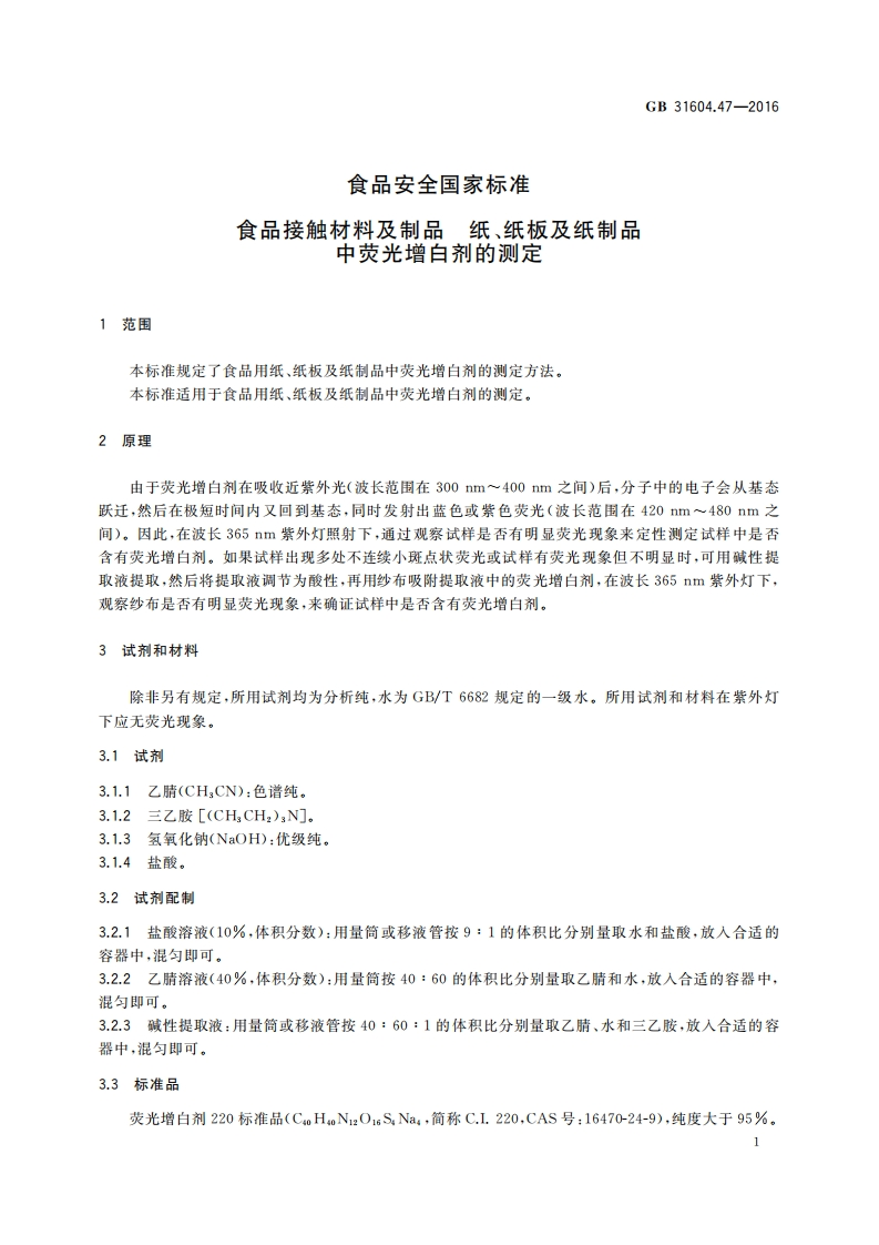 GB31604.47-2016食品安全国家标准品接触材料及制品经纸、纸板及纸制品中荧光增白剂的测定_食品安全国家标准品接触材料及制品纸、纸板及纸制品中荧光增白剂的测定348072@abc5天前发布关注私信0.31MB6页050GB31604.47-2016食品安全国家标准品接触材料及制品经纸、纸板及纸制品中荧光增白剂的测定_食品安全国家标准品接触材料及制品纸、纸板及纸制品中荧光增白剂的测定此内容为付费资源,请付费后查看¥19¥23黄金会员免费钻石会员免费立即购买您当前未登录!建议登陆后购买,可保存购买订单付费资源 第1页 / 共6页 第2页 / 共6页 第3页 / 共6页 试读已结束,还剩3页,您可下载完整版后进行离线阅读 THE END标准规范餐饮美食 文本预览 中华人民共和国国家标准GB31604.47-2016食品安全国家标准食品接触材料及制品纸、纸板及纸制品中荧光增白剂的测定2016-10-19发布2017-04-19实施中华人民共和国国家卫生和计划生育委员会发布 查看更多 收起部分 喜欢就支持一下吧收藏