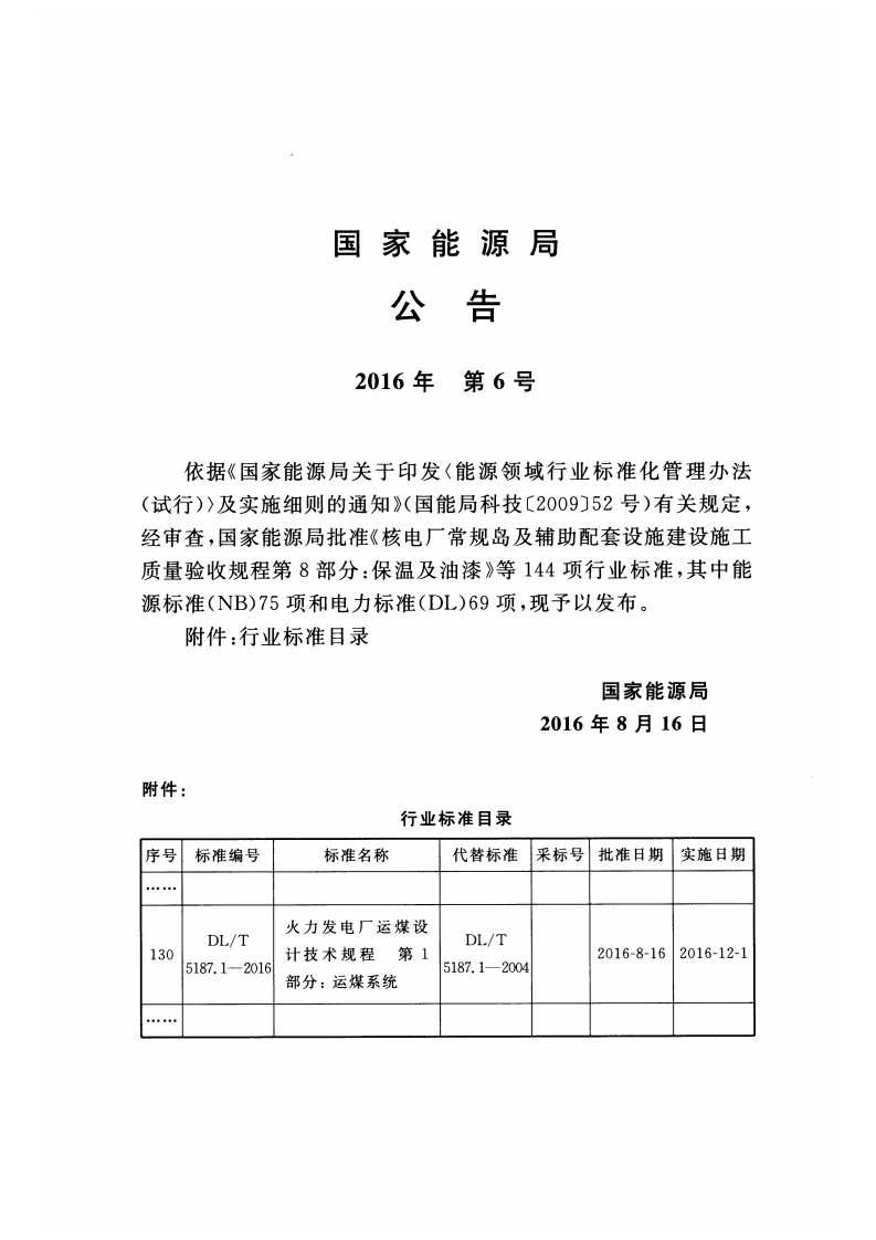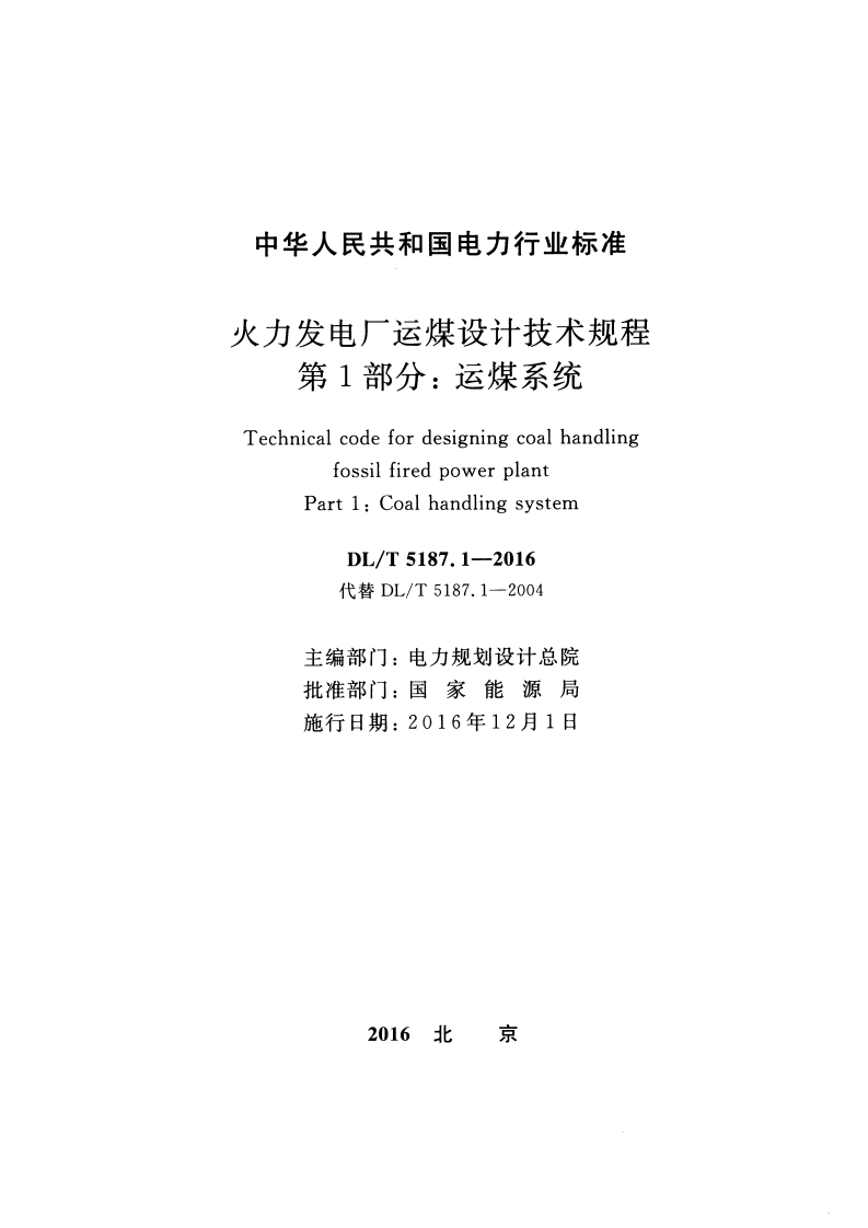 ICS27.100P61备案号:J353一2016DL中华人民共和国电力行业标准PDL/T5187.12016代替DL/T5187.1一2004火力发电厂运煤设计技术规程第1部分:运煤系统Technical code for designing coal handlingfossil fired power plantpart 1:Coal handling system2016-08-16发布2016-12-01实施国家能源局发布