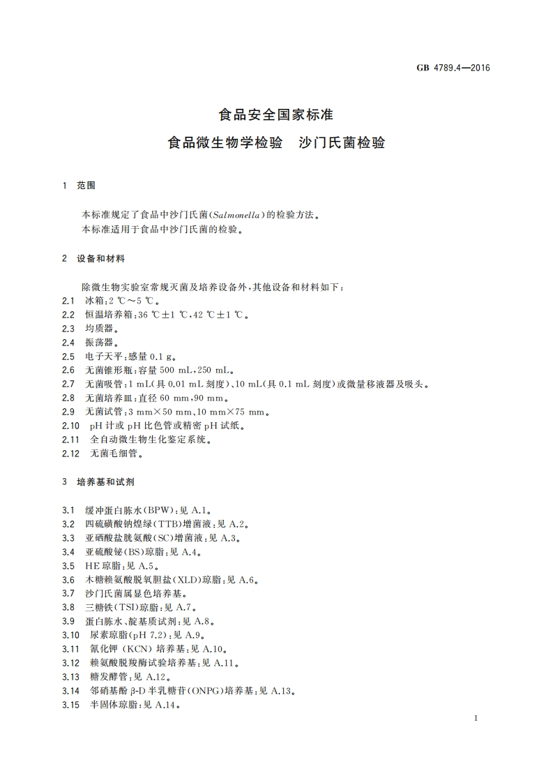 GB4789.4-2016食品安全国家标准沙门氏菌检验食品微生物学检验_食品安全国家标准食品微生物学检验,沙门氏菌检验348072@abc30天前发布关注私信0.56MB22页020GB4789.4-2016食品安全国家标准沙门氏菌检验食品微生物学检验_食品安全国家标准食品微生物学检验,沙门氏菌检验此内容为付费资源,请付费后查看¥19¥23黄金会员免费钻石会员免费立即购买您当前未登录!建议登陆后购买,可保存购买订单付费资源 第1页 / 共22页 第2页 / 共22页 第3页 / 共22页 试读已结束,还剩19页,您可下载完整版后进行离线阅读 THE END标准规范餐饮美食 文本预览 B中华人民共和国国家标准GB4789.4-2016食品安全国家标准食品微生物学检验沙门氏菌检验2016-12-23发布2017-06-23实施中华人民共和国国家卫生和计划生育委员会国家食品药品监督管理总局发布 查看更多 收起部分 喜欢就支持一下吧收藏
