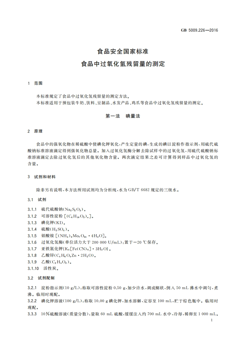 GB5009.226-2016食品安全国家标准食品中过氧化氢残留量的测定_食品安全国家标准食品中过氧化氢残留量的测定348072@abc29天前发布关注私信0.24MB7页042GB5009.226-2016食品安全国家标准食品中过氧化氢残留量的测定_食品安全国家标准食品中过氧化氢残留量的测定此内容为付费资源,请付费后查看¥19¥23黄金会员免费钻石会员免费立即购买您当前未登录!建议登陆后购买,可保存购买订单付费资源 第1页 / 共7页 第2页 / 共7页 第3页 / 共7页 试读已结束,还剩4页,您可下载完整版后进行离线阅读 THE END标准规范餐饮美食 文本预览 GB中华人民共和国国家标准GB5009.226-2016食品安全国家标准食品中过氧化氢残留量的测定2016-08-31发布2017-03-01实施中华人民共和国国家卫生和计划生育委员会发布 查看更多 收起部分 喜欢就支持一下吧收藏