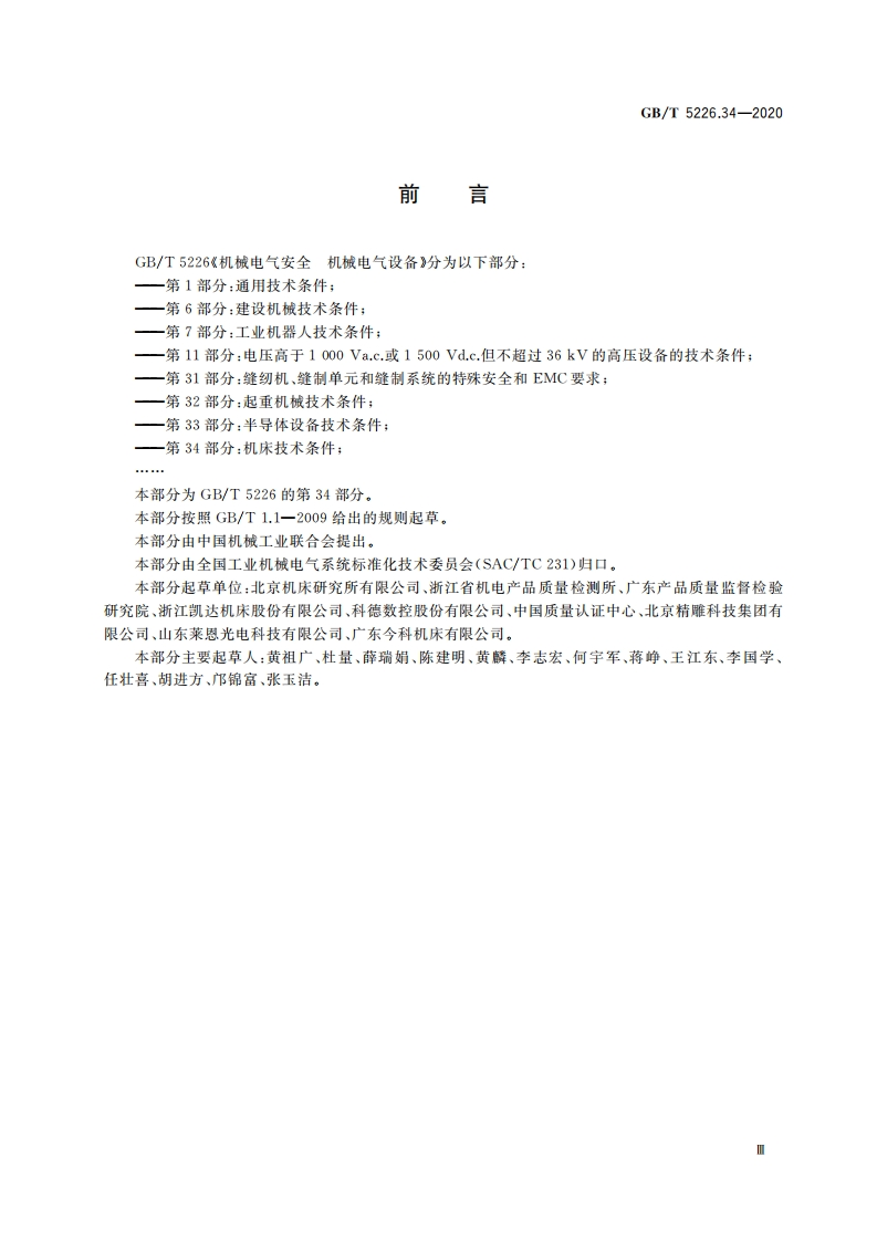 ICS29.020J09B中华人民共和国国家标准GB/T5226.34-2020机械电气安全机械电气设备第34部分:机床技术条件Electrical safety of machinery-Electrical equipment of machines-Part 34:Requirements for machine tools2020-04-28发布2020-11-01实施国家市场监督管理总局发布国家标准化管理委员会