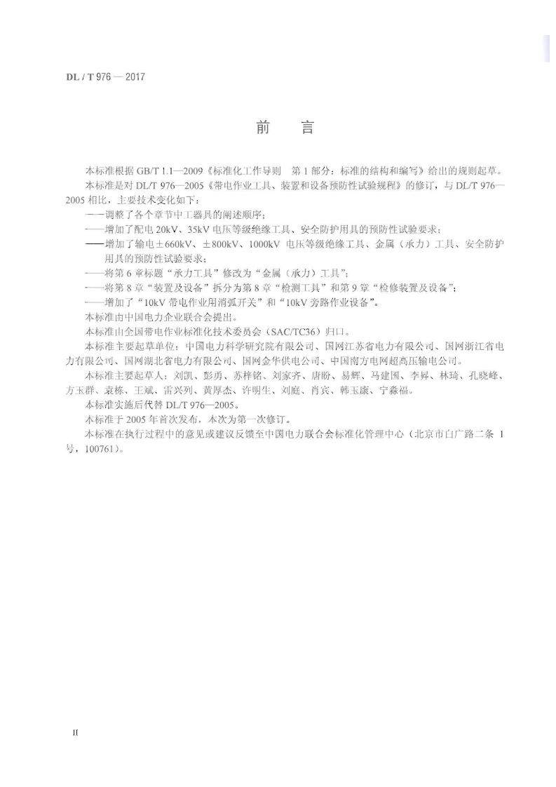 ICS29.020K60备案号:61616-2018DL中华人民共和国电力行业标准DL/T976一2017代替DL/T976一2005带电作业工具、装置和设备预防性试验规程Preventive test code of tools,devices and equipment for live-working2017-11-15发布2018-03-01实施国家能源局发布