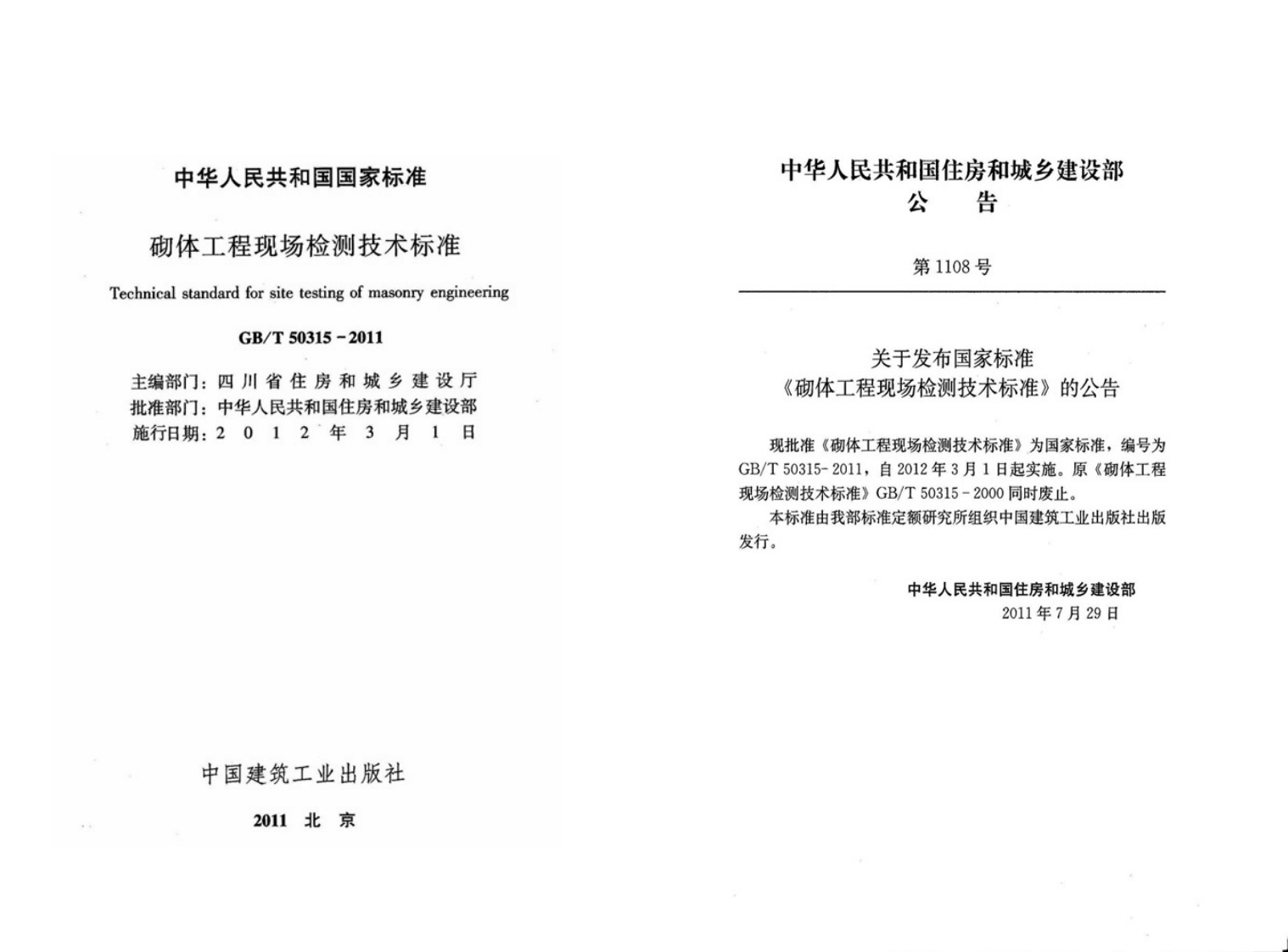 UDC中华人民共和国国家标准PGB/T50315-2011砌体工程现场检测技术标准Technical standard for site testing of masonry engineering中华人民共和国国家标准砌体工程现场检测技术标准Technical standard for site testing of masonry engineeringGB/T50315-2011中国建筑工业出版社出版、发行(北京西郊百万庄)各地新华书店、建筑书店经销北京红光制版公司制版北京市密东印刷有限公司印刷开本:850×1168毫米1/32印张:3%字数:98千字2011年10月第一版2011年10月第一次印刷定价:19.00元统一书号:15112·210892011-07-29发布2012-03-01实施版权所有翻印必究如有印装质量问题,可寄本社退换(邮政编码100037)本社网址:http:/www.cabp.com.cn中华人民共和国住房和城乡建设部网上书店:http:/www.china-building.com.cn中华人民共和国国家质量监督检验检疫总局联合发布