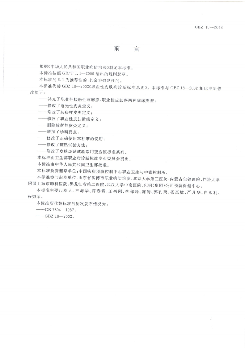 GBZ18-2013代替GBZ18-2002职业性皮肤病的诊断总则Diagnosisofoccupationalskindiseases-Generalguideline348072@abc30天前发布关注私信4.55MB11页026GBZ18-2013代替GBZ18-2002职业性皮肤病的诊断总则Diagnosisofoccupationalskindiseases-Generalguideline此内容为付费资源,请付费后查看¥19¥23黄金会员免费钻石会员免费立即购买您当前未登录!建议登陆后购买,可保存购买订单付费资源 第1页 / 共11页 第2页 / 共11页 第3页 / 共11页 试读已结束,还剩8页,您可下载完整版后进行离线阅读 THE END标准规范餐饮美食 文本预览 ICS13.100C60B☑中华人民共和国国家职业卫生标准GBZ18-2013代替GBZ18一2002职业性皮肤病的诊断总则Diagnosis of occupational skin diseases-General guideline2013-02-07发布2013-08-01实施中华人民共和国卫生都发布 查看更多 收起部分 喜欢就支持一下吧收藏