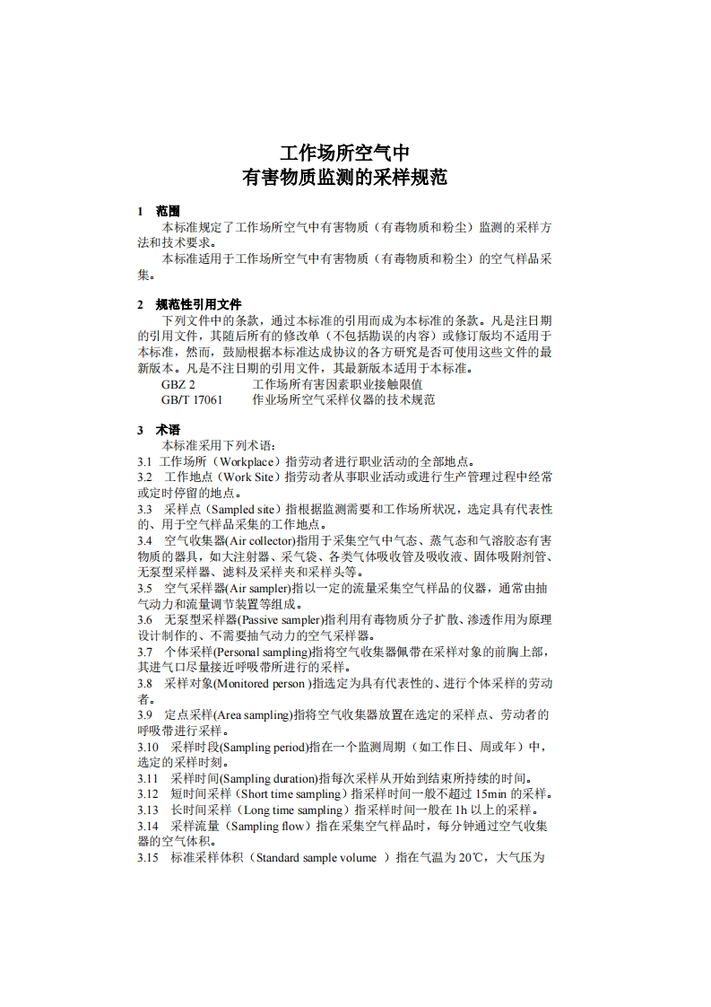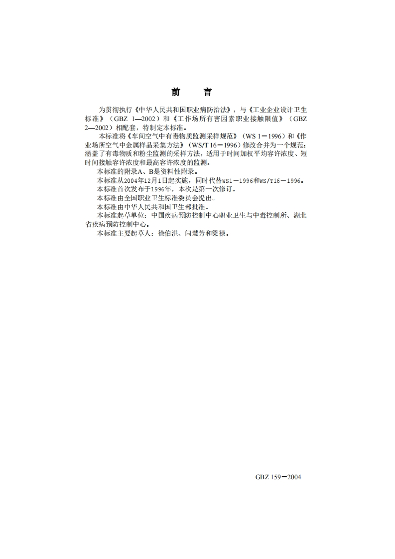 GBZ中华人民共和国国家职业卫生标准规范GBZ159-2004工作场所空气中有害物质监测的采样规范Specificationsofairsamplingforhazardoussubstancesmonitoringintheworkplace348072@abc16天前发布关注私信48.23KB12页031GBZ中华人民共和国国家职业卫生标准规范GBZ159-2004工作场所空气中有害物质监测的采样规范Specificationsofairsamplingforhazardoussubstancesmonitoringintheworkplace此内容为付费资源,请付费后查看¥19¥23黄金会员免费钻石会员免费立即购买您当前未登录!建议登陆后购买,可保存购买订单付费资源 第1页 / 共12页 第2页 / 共12页 第3页 / 共12页 试读已结束,还剩9页,您可下载完整版后进行离线阅读 THE END标准规范餐饮美食 文本预览 C52GBZ中华人民共和国国家职业卫生标准GBZ159-2004工作场所空气中有害物质监测的采样规范Specifications of air samplingfor hazardous substances monitoring in the workplace发布实施中华人民共和国卫生部发布GBZ159-2004 查看更多 收起部分 喜欢就支持一下吧收藏