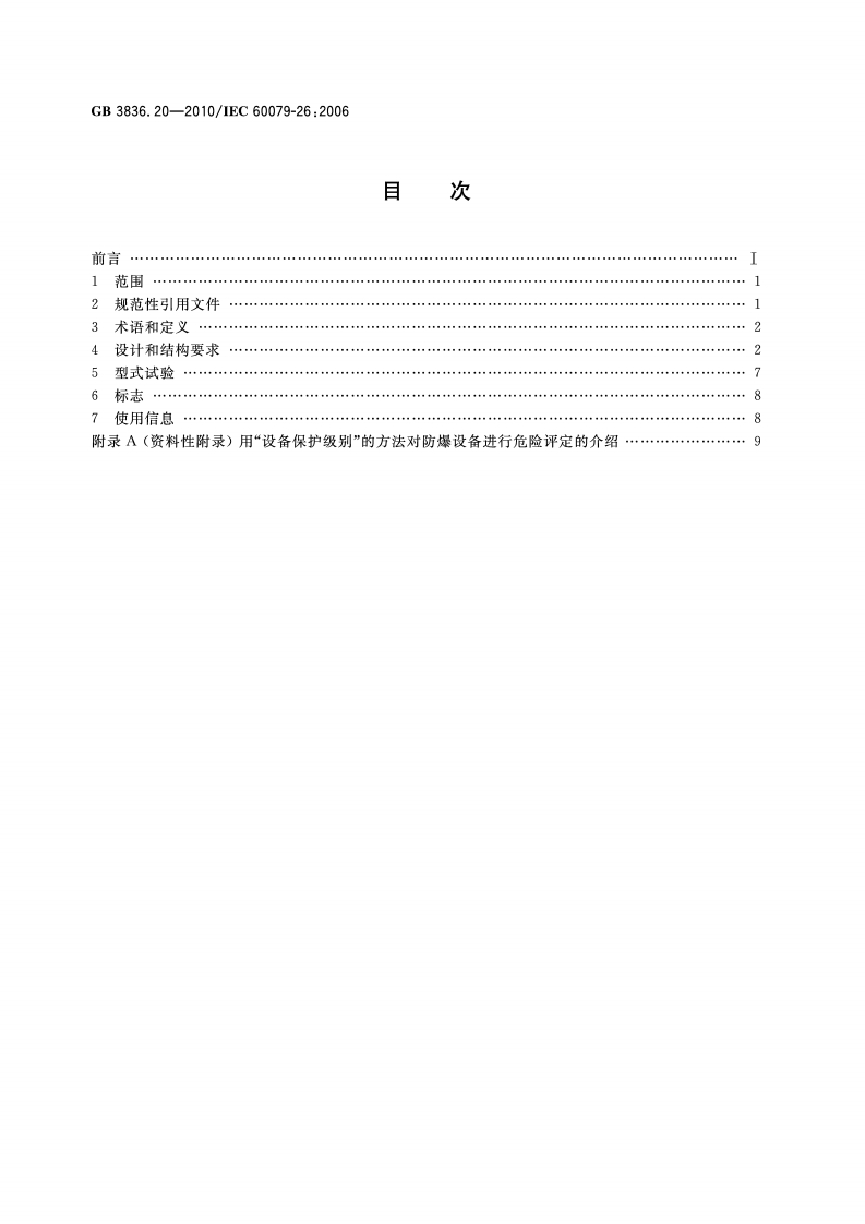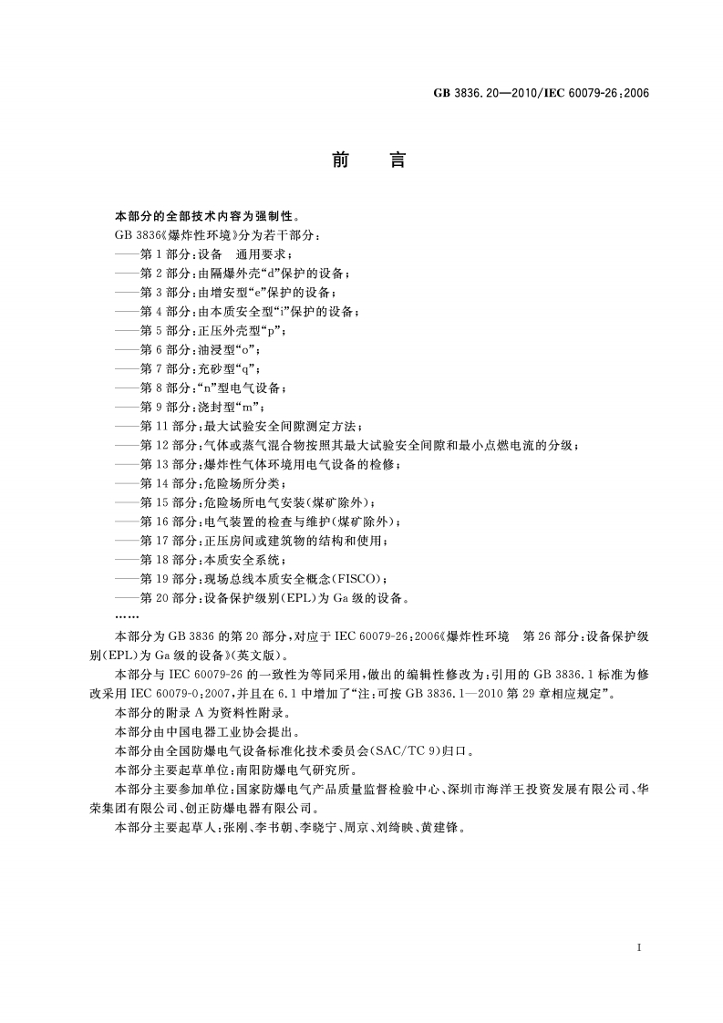 1CS29.260.20K35中华人民共和国国家标准GB3836.20一2010/IEC60079-26:2006爆炸性环境第20部分:设备保护级别(EPL)为Ga级的设备Explosive atmospheres-Part 20:Equipment withequipment protection level (EPL)Ga(IEC60079-26:2006,IDT)2010-11-10发布2011-09-01实施中华人民共和国国家质量监督检验检疫总局中国国家标准化管理委员会发布
