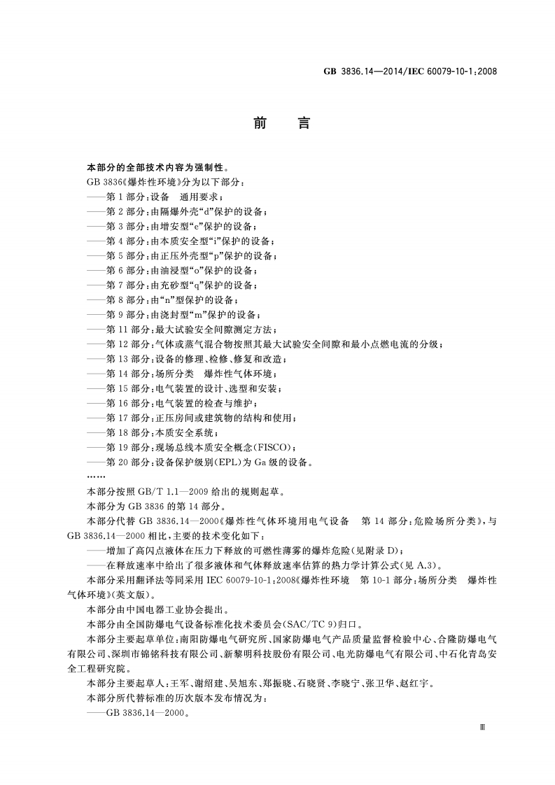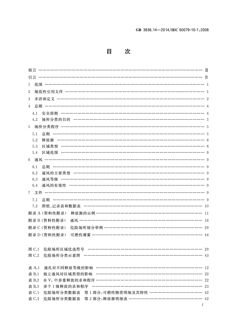 ICS29.260.20K35中华人民共和国国家标准GB3836.14一2014/EC60079-10-1:2008代楼GB3836.14一2000爆炸性环境第14部分:场所分类爆炸性气体环境Explosive atmospheres-Part 14:Classification of areas-Explosive gas atmosphere(IEC 60079-10-1:2008,Explosive atmospheres-Part 10-1:Classification of areas-Explosive gas atmosphere,IDT)2014-12-05发布2015-10-16实施中华人民共和国国家质量监督检验检疫总局中国国家标准化管理委员会发布