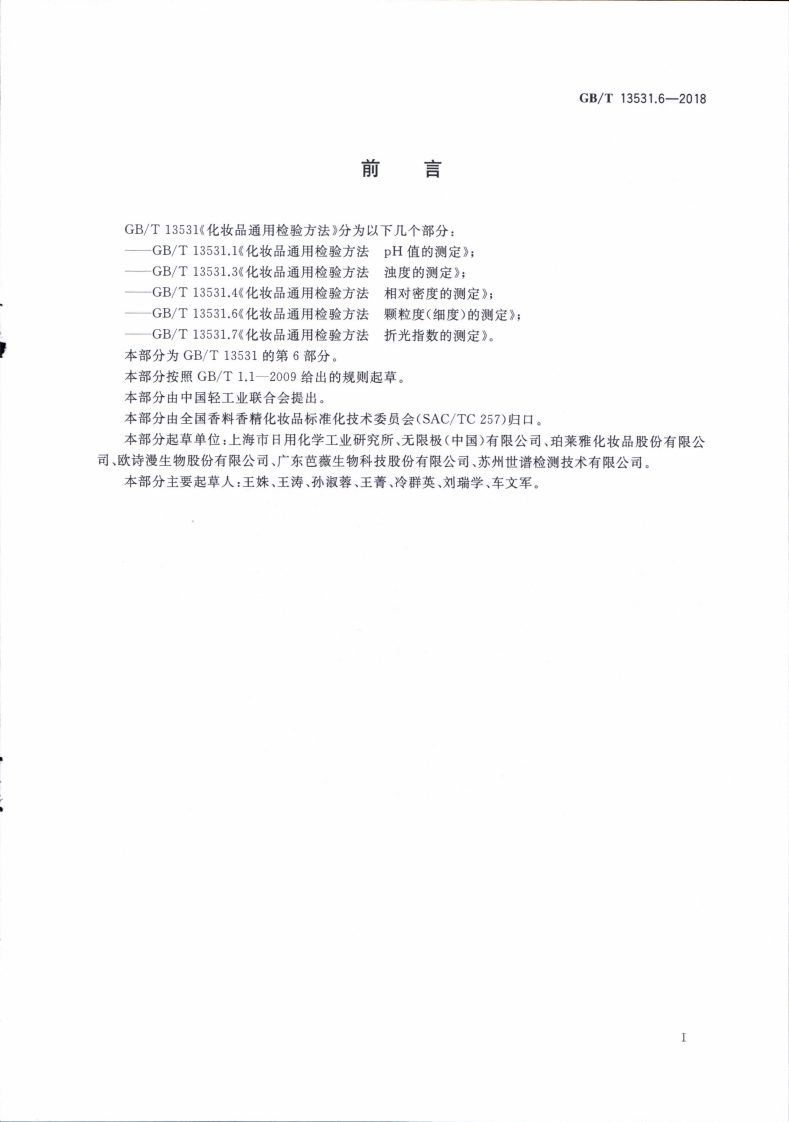 GB_T13531.6-2018化妆品通用检验方法颗粒度(细度)的测定GeneralmethodsondeterminationofcosmeticsDeterminationofparticalsize_化妆品通用检验方法颗粒度(细度)的测定GeneralmethodsondeterminationofcosmeticsDeterminationofparticalsize348072@abc16天前发布关注私信2.29MB5页032GB_T13531.6-2018化妆品通用检验方法颗粒度(细度)的测定GeneralmethodsondeterminationofcosmeticsDeterminationofparticalsize_化妆品通用检验方法颗粒度(细度)的测定GeneralmethodsondeterminationofcosmeticsDeterminationofparticalsize此内容为付费资源,请付费后查看¥19¥23黄金会员免费钻石会员免费立即购买您当前未登录!建议登陆后购买,可保存购买订单付费资源 第1页 / 共5页 第2页 / 共5页 第3页 / 共5页 试读已结束,还剩2页,您可下载完整版后进行离线阅读 THE END标准规范餐饮美食 文本预览 1CS71.100.70Y42B中华人民共和国国家标准GB/T13531.6-2018化妆品通用检验方法颗粒度(细度)的测定General methods on determination of cosmetics-Determination of partical size2018-02-06发布2018-09-01实施中华人民共和国国家质量监督检验检疫总局发布Φ应中国国家标准化管理委员会 查看更多 收起部分 喜欢就支持一下吧收藏