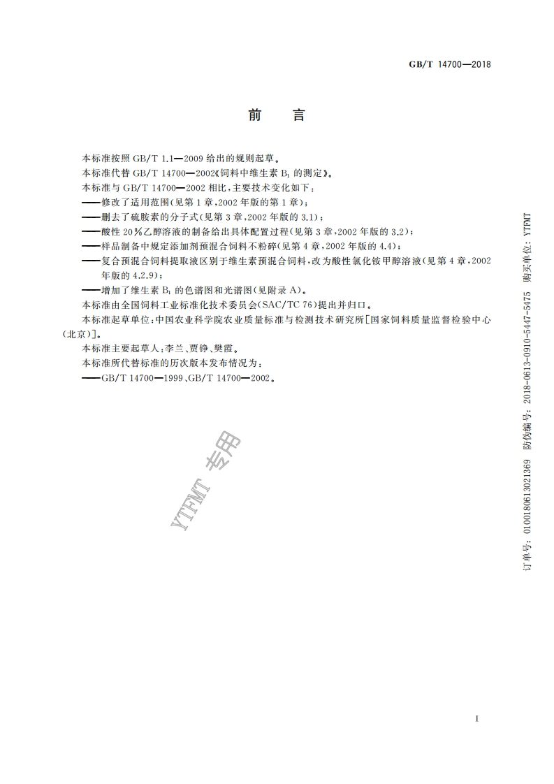 GB_T14700-2018代替GB_T14700-2002饲料中维生素B,的测定Determinationofthiamineinfeed_饲料中维生素B,的测定Determinationofthiamineinfeed348072@abc31天前发布关注私信0.53MB12页031GB_T14700-2018代替GB_T14700-2002饲料中维生素B,的测定Determinationofthiamineinfeed_饲料中维生素B,的测定Determinationofthiamineinfeed此内容为付费资源,请付费后查看¥19¥23黄金会员免费钻石会员免费立即购买您当前未登录!建议登陆后购买,可保存购买订单付费资源 第1页 / 共12页 第2页 / 共12页 第3页 / 共12页 试读已结束,还剩9页,您可下载完整版后进行离线阅读 THE END标准规范餐饮美食 文本预览 ICS65.120B46中华人民共和国国家标准GB/T14700一2018代替GB/T14700一2002饲料中维生素B,的测定Determination of thiamine in feed2018-05-14发布2018-12-01实施国家市场监督管理总局中国国家标准化管理委员会发布 查看更多 收起部分 喜欢就支持一下吧收藏