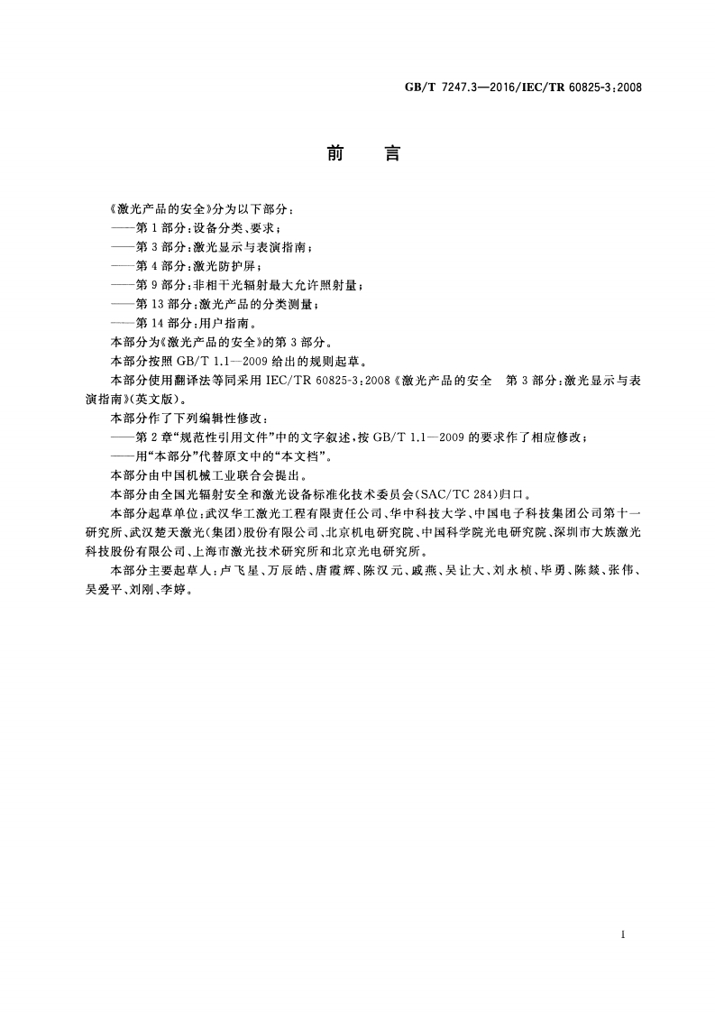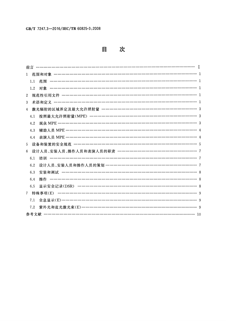 1CS31.260L51GB中华人民共和国国家标准GB/T7247.3一2016/IEC/TR60825-3:2008激光产品的安全第3部分:激光显示与表演指南Safety of laser products-Part 3:Guidance for laser display and shows(IEC/TR60825-3:2008,IDT)2016-08-29发布2017-03-01实施中华人民共和国国家质量监督检验检疫总局中国国家标准化管理委员会发布