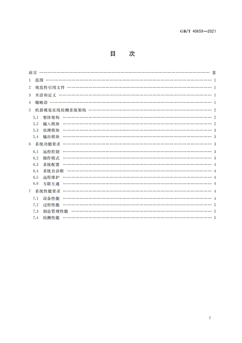 ICS35.240.50CCSL67GB中华人民共和国国家标准GB_T40659-2021智能制造机器视觉在线检测系统通用要求348072@abc10天前发布关注私信0.67MB8页024ICS35.240.50CCSL67GB中华人民共和国国家标准GB_T40659-2021智能制造机器视觉在线检测系统通用要求此内容为付费资源,请付费后查看¥19¥23黄金会员免费钻石会员免费立即购买您当前未登录!建议登陆后购买,可保存购买订单付费资源 第1页 / 共8页 第2页 / 共8页 第3页 / 共8页 试读已结束,还剩5页,您可下载完整版后进行离线阅读 THE END标准规范餐饮美食 文本预览 ICS35.240.50CCS L 67中华人民共和国国家标准GB/T40659-2021智能制造机器视觉在线检测系统通用要求Intelligent manufacturing-Online detection system based on machine vision-General requirements2021-10-11发布2022-05-01实施国家市场监督管理总局国家标准化管理委员会发布 查看更多 收起部分 喜欢就支持一下吧收藏