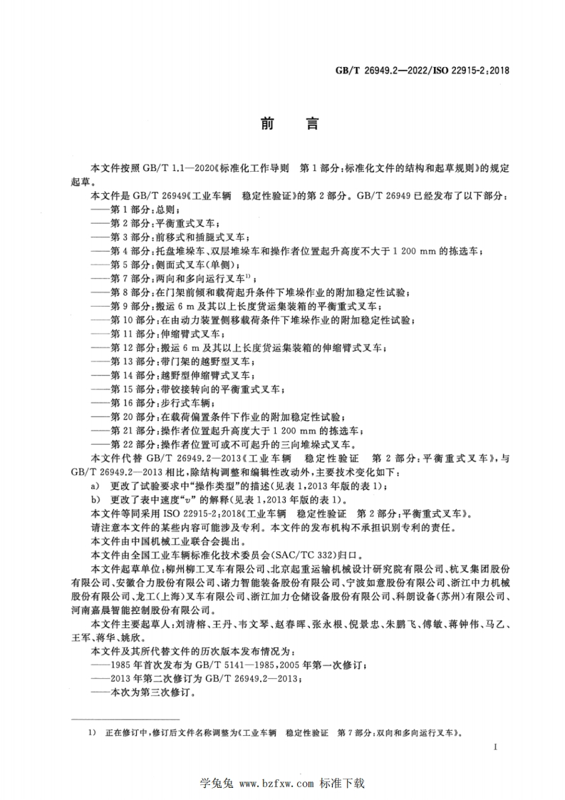 ICs53.060CCS J 83GB中华人民共和国国家标准GB/T26949.2-2022/1S022915-2:2018代替GB/T26949.2一2013工业车辆稳定性验证第2部分:平衡重式叉车Industrial trucks-Verification of stability-Part 2:Counterbalanced trucks with mast(IS022915-2:2018,IDT)2022-12-30发布2023-04-01实施国家市场监督管理总局国家标准化管理委员会发布学兔免ww.bzfxw..com标准下载