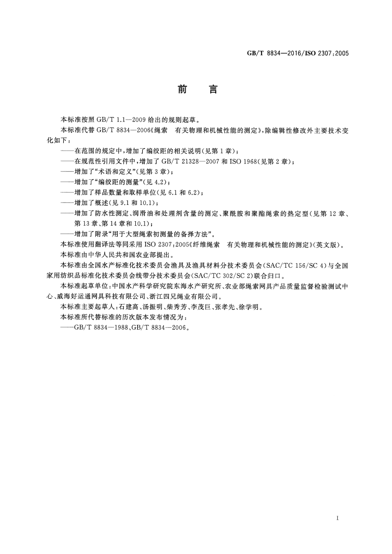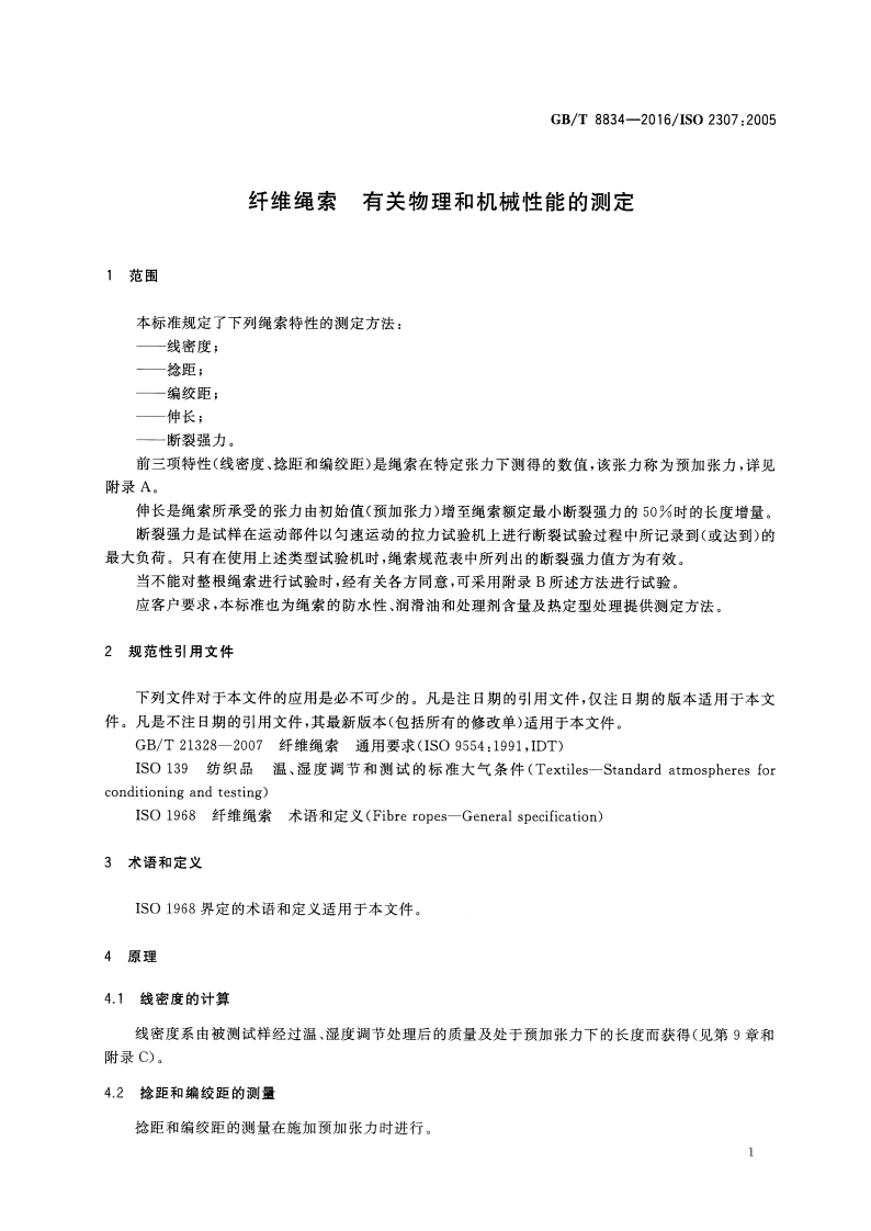 ICs59.080.50B56中华人民共和国国家标准GB/T8834-2016/1S02307:2005代替GB/T8834—2006纤维绳索有关物理和机械性能的测定Fibre ropes-Determination of certain physical and mechanical properties(IS02307:2005,IDT)2016-06-14发布2017-01-01实施中华人民共和国国家质量监督检验检疫总局中国国家标准化管理委员会发布