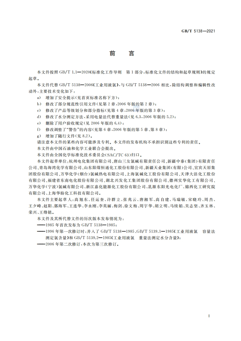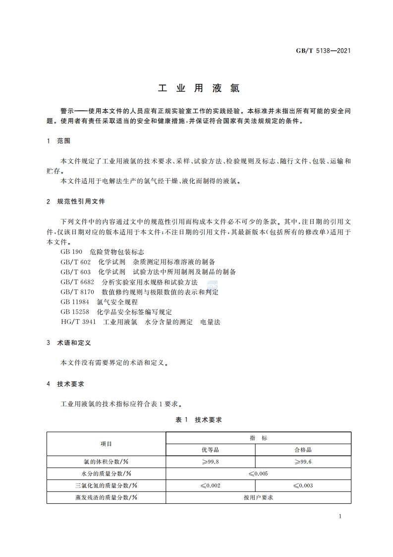 ICS71.060.10CCSG13GB中华人民共和国国家标准GB_T5138-2021代替GB_T5138-2006工业用液氯Liguidchlorineforindustrialuse348072@abc9天前发布关注私信0.92MB11页032ICS71.060.10CCSG13GB中华人民共和国国家标准GB_T5138-2021代替GB_T5138-2006工业用液氯Liguidchlorineforindustrialuse此内容为付费资源,请付费后查看¥19¥23黄金会员免费钻石会员免费立即购买您当前未登录!建议登陆后购买,可保存购买订单付费资源 第1页 / 共11页 第2页 / 共11页 第3页 / 共11页 试读已结束,还剩8页,您可下载完整版后进行离线阅读 THE END标准规范餐饮美食 文本预览 ICs71.060.10CCS G 13GB中华人民共和国国家标准GB/T5138-2021代替GB/T5138-2006工业用液氯Liquid chlorine for industrial use2021-08-20发布2022-07-01实施国家市场监督管理总局发布国家标准化管理委员会 查看更多 收起部分 喜欢就支持一下吧收藏