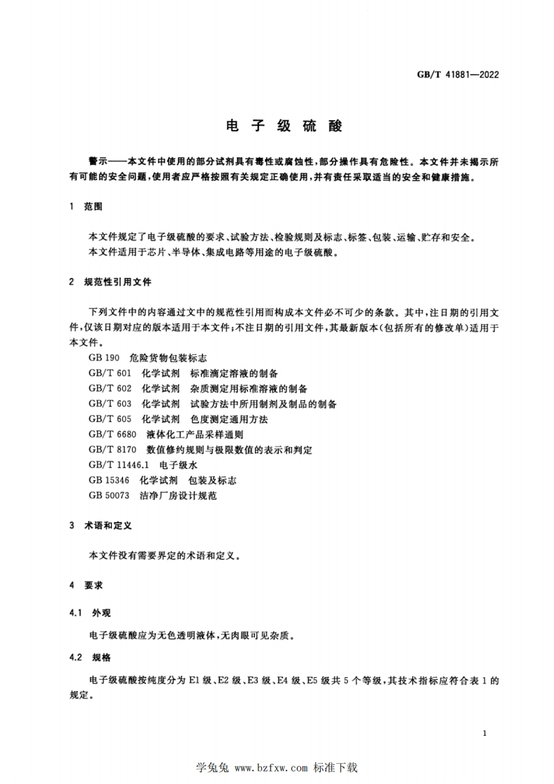 ICS71.060.30CCSG11GB中华人民共和国国家标准GB_T41881-2022电子级硫酸Electronicgradesulphuricacid348072@abc9天前发布关注私信3.38MB11页033ICS71.060.30CCSG11GB中华人民共和国国家标准GB_T41881-2022电子级硫酸Electronicgradesulphuricacid此内容为付费资源,请付费后查看¥19¥23黄金会员免费钻石会员免费立即购买您当前未登录!建议登陆后购买,可保存购买订单付费资源 第1页 / 共11页 第2页 / 共11页 第3页 / 共11页 试读已结束,还剩8页,您可下载完整版后进行离线阅读 THE END标准规范餐饮美食 文本预览 g7&90.30GB中华人民共和国国家标准GB/T41881-2022电子级硫酸Electronic grade sulphuric acid2022-10-12发布2023-05-01实施国家市场监督管理总局国家标准化管理委员会发布学兔免www.bzfxw.com标准下载 查看更多 收起部分 喜欢就支持一下吧收藏