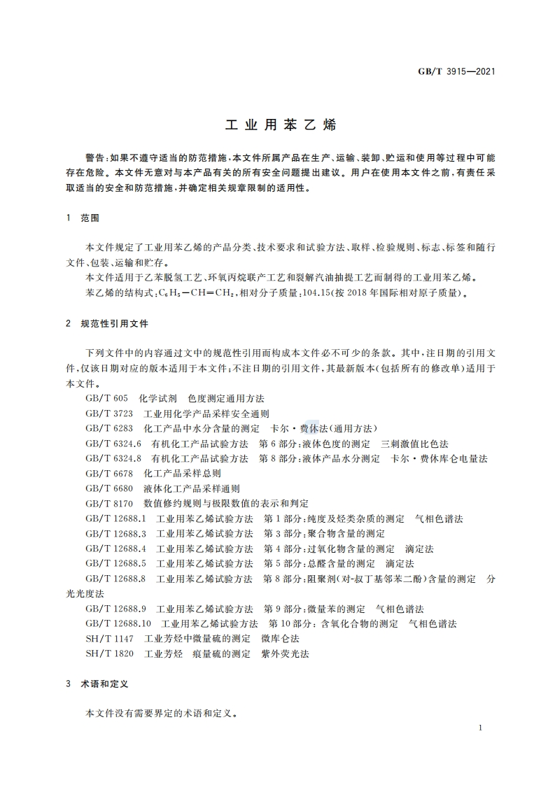 ICS71.080.15CCSG16GB中华人民共和国国家标准GB_T3915-2021代替GB_T3915-2011工业用苯乙烯Styreneforindustrialuse348072@abc9天前发布关注私信0.53MB8页042ICS71.080.15CCSG16GB中华人民共和国国家标准GB_T3915-2021代替GB_T3915-2011工业用苯乙烯Styreneforindustrialuse此内容为付费资源,请付费后查看¥19¥23黄金会员免费钻石会员免费立即购买您当前未登录!建议登陆后购买,可保存购买订单付费资源 第1页 / 共8页 第2页 / 共8页 第3页 / 共8页 试读已结束,还剩5页,您可下载完整版后进行离线阅读 THE END标准规范餐饮美食 文本预览 ICs71.080.15CCS G 16B中华人民共和国国家标准GB/T3915-2021代替GB/T3915-2011工业用苯乙烯Styrene for industrial use2021-08-20发布2022-03-01实施国家市场监督管理总局发布国家标准化管理委员会 查看更多 收起部分 喜欢就支持一下吧收藏