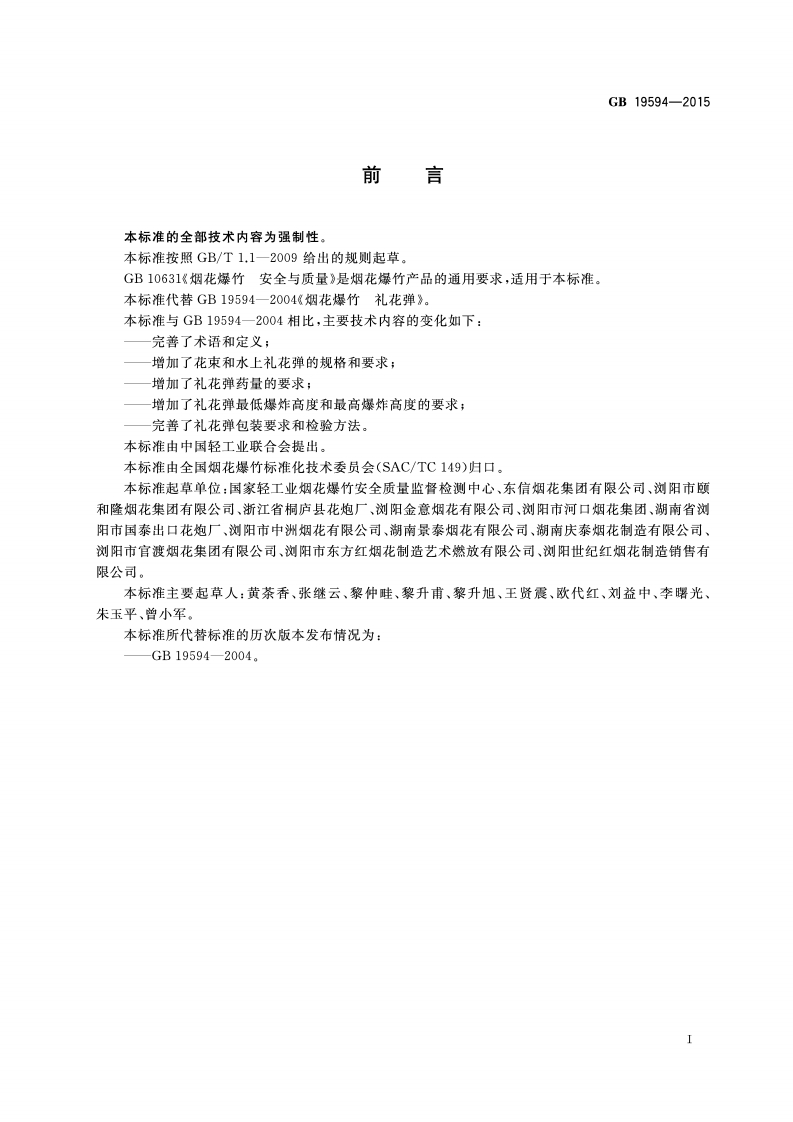 ICS71.100.30Y88GB中华人民共和国国家标准GB19594-2015代替GB19594-2004烟花爆竹礼花弹Fireworks-Displayshell348072@abc11天前发布关注私信0.58MB11页039ICS71.100.30Y88GB中华人民共和国国家标准GB19594-2015代替GB19594-2004烟花爆竹礼花弹Fireworks-Displayshell此内容为付费资源,请付费后查看¥19¥23黄金会员免费钻石会员免费立即购买您当前未登录!建议登陆后购买,可保存购买订单付费资源 第1页 / 共11页 第2页 / 共11页 第3页 / 共11页 试读已结束,还剩8页,您可下载完整版后进行离线阅读 THE END标准规范餐饮美食 文本预览 ICS71.100.30Y88中华人民共和国国家标准GB19594-2015代替GB19594一2004烟花爆竹礼花弹Fireworks-Display shell2015-02-04发布2016-04-01实施中华人民共和国国家质量监督检验检疫总局中国国家标准化管理委员会发布 查看更多 收起部分 喜欢就支持一下吧收藏