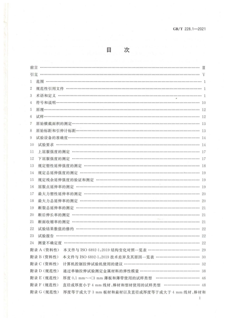 1CS77.040.10CCS H 22GB中华人民共和国国家标准GB/T228.1-2021代替GB/T228.1-2010金属材料拉伸试验第1部分:室温试验方法Metallic materials-Tensile testing-Part 1:Method of test at room temperature(IS06892-1:2019,MOD)2021-12-31发布2022-07-01实施国家市场监督管理总局国家标准化管理委员会发布