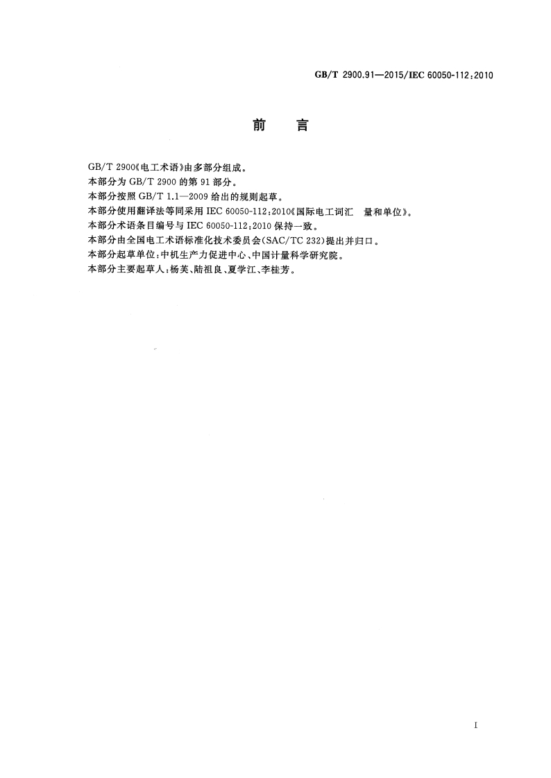 1CS01.040.07K04中华人民共和国国家标准GB/T2900.91一2015/IEC60050-112:2010电工术语量和单位Electrotechnical terminology-Quantities and units(IEC 60050-112:2010,International electrotechnical vocabulary-Part 112:Quantities and units,IDT)2015-09-11发布2016-04-01实施中华人民共和国国家质量监督检验检疫总局中国国家标准化管理委员会发布