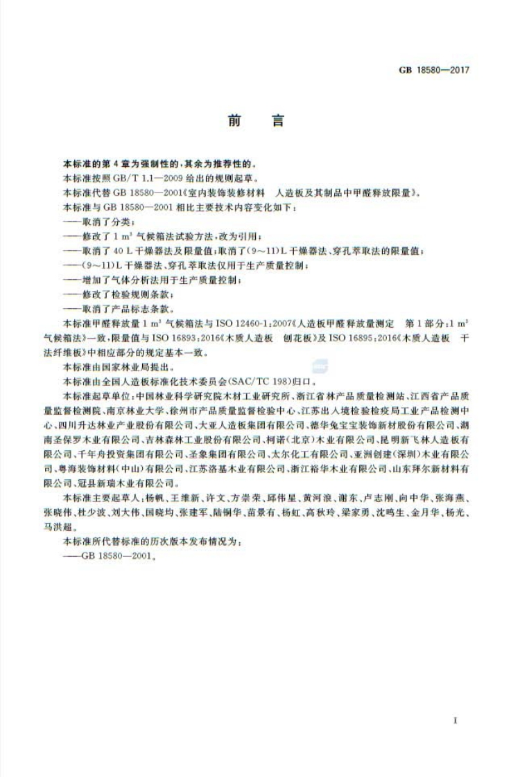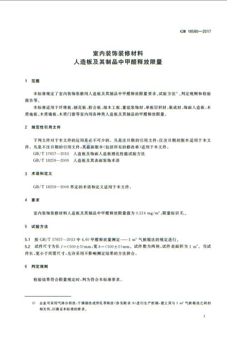 1Cs79.060.01B70中华人民共和国国家标准GB18580-2017代替GB18580-2001室内装饰装修材料人造板及其制品中甲醛释放限量Indoor decorating and refurbishing materials-Limit of formaldehyde emission of wood-based panels and finishing products2017-04-22发布2018-05-01实施中华人民共和国国家质量监督检验检疫总局中国国家标准化管理委员会发布