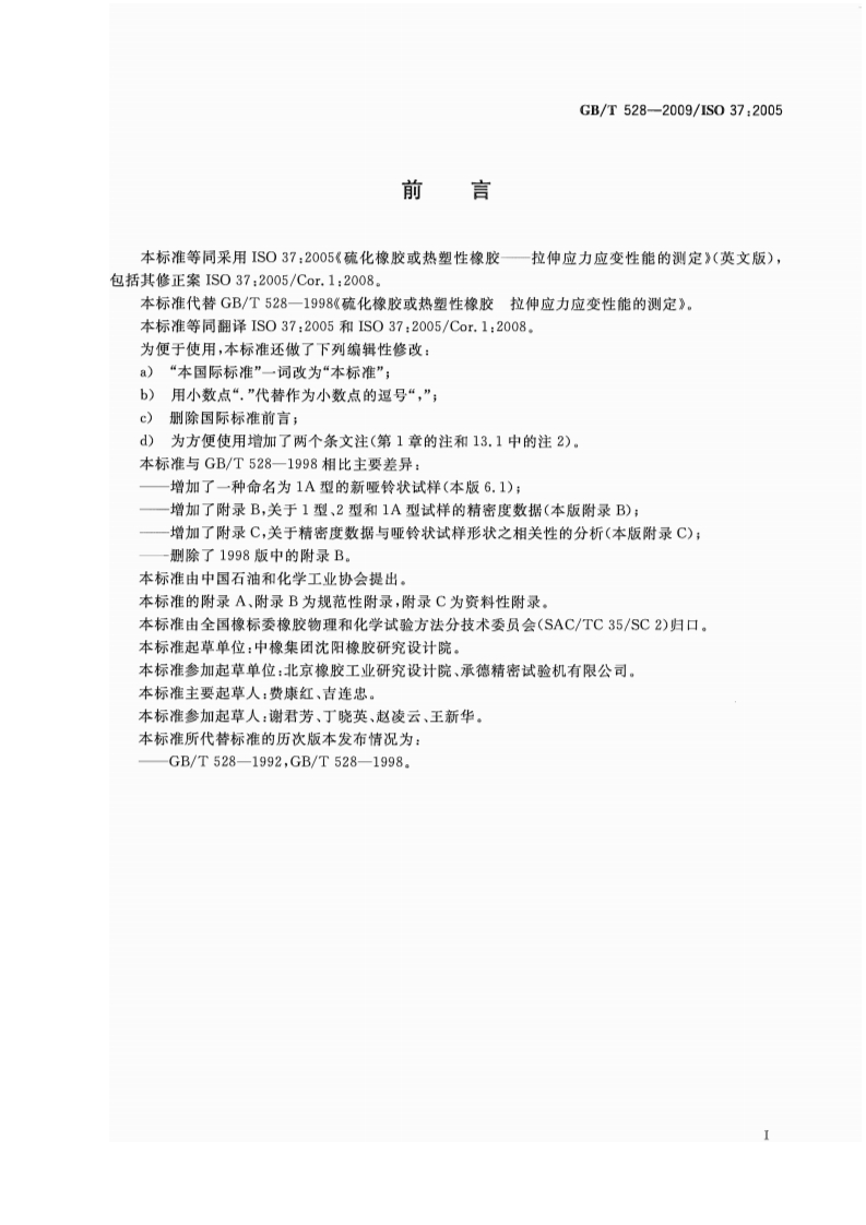 1Cs83.060G40中华人民共和国国家标准GB/T528-2009/1S037:2005代替GB/T528-1998硫化橡胶或热塑性橡胶拉伸应力应变性能的测定Rubber,vulcanized or thermoplastic-Determination of tensile stress-strain properties(IS037:2005,IDT)2009-04-24发布2009-12-01实施中华人民共和国国家质量监督检验检疫总局中国国家标准化管理委员会发布
