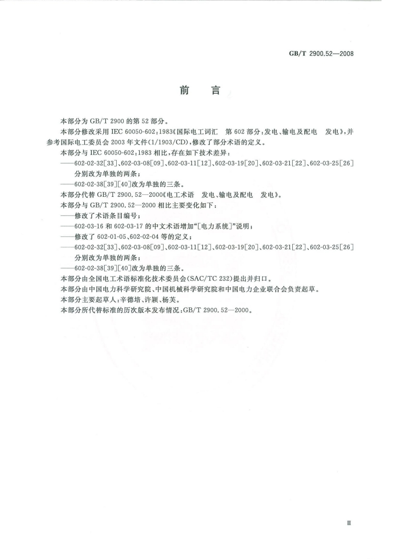 1CS01.040.29K04中华人民共和国国家标准GB/T2900.52-2008代替GB/T2900.52—2000电工术语发电、输电及配电发电Electrotechnical terminology-Generation,transmission and distribution of electricity-Generation(IEC60050-602:1983,MOD)2008-06-18发布2009-05-01实施中华人民共和国国家质量监督检验检疫总局数码防伪中国国家标准化管理委员会发布
