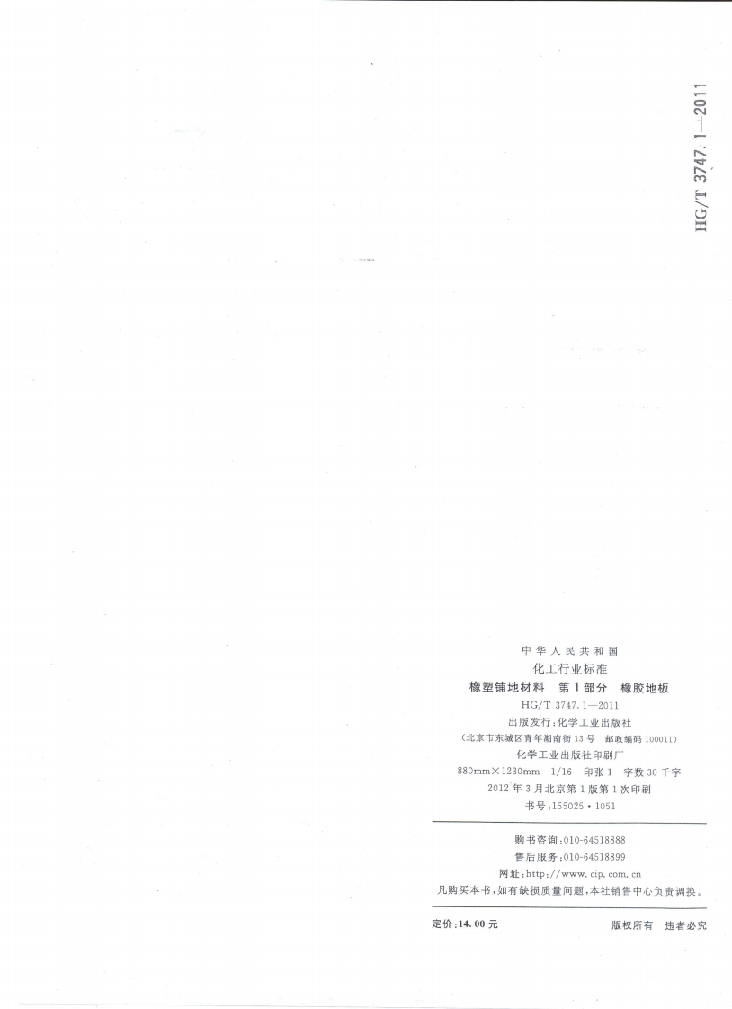 1CS83.140.99G47备案号:34542-2012HG中华人民共和国化工行业标准HG/T3747.1-2011代替HG/T3747.1一2004橡塑铺地材料第1部分橡胶地板Rubber and plastic floor covering material Part 1 Rubber floor coverings(mod EN 12199 1998,Resilent floor coverings-Specifications for homogeneousand heterogeneous relief rubber floor coverings)2011-12-20发布2012-07-01实施中华人民共和国工业和信息化部发布