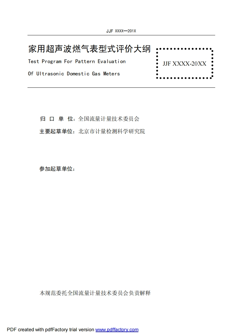 可月中华人民共和国国家计量技术规范JJF XXXX-20XX家用超声波燃气表型式评价大纲Test Progr am For Pattern Eval uati onOf Ultrasoni c Domestic Gas Met ers(征求意见稿)20XX-XX-XX发布20XX-XX-XX实施国家质量监督检验检疫总局发布PDF created with pdfFactory trial version www.pdffactory.com