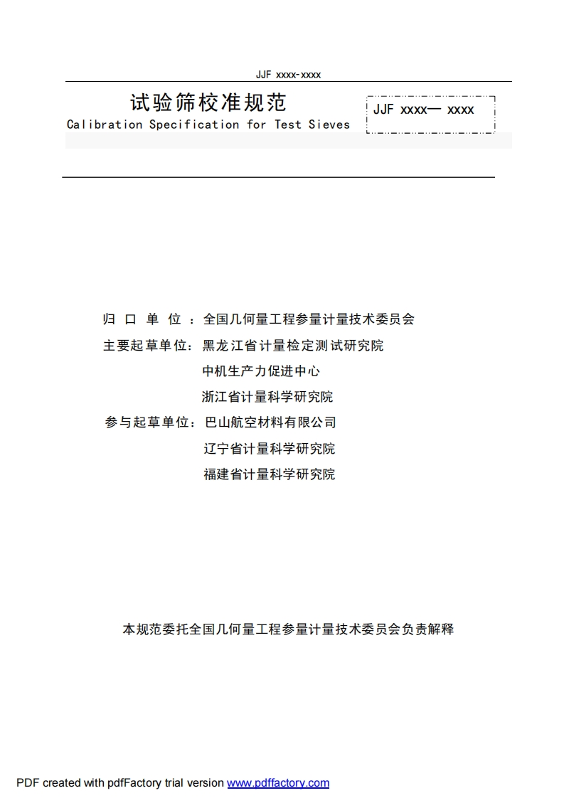 JJFxxxx-xxxX试验筛校准规范CalibrationSpecificationforTestSieves_试验筛校准规范CalibrationSpecificationforTestSieves348072@abc6天前发布关注私信0.24MB23页032JJFxxxx-xxxX试验筛校准规范CalibrationSpecificationforTestSieves_试验筛校准规范CalibrationSpecificationforTestSieves此内容为付费资源,请付费后查看¥19¥23黄金会员免费钻石会员免费立即购买您当前未登录!建议登陆后购买,可保存购买订单付费资源 第1页 / 共23页 第2页 / 共23页 第3页 / 共23页 试读已结束,还剩20页,您可下载完整版后进行离线阅读 THE END标准规范餐饮美食 文本预览 JJF中华人民共和国国家计量技术规范JJF xxxx-xxxx试验筛校准规范Calibration Specification for Test SievesxxXX一Xx一Xx发布XXXX一XX一XX实施国家质量监督检验检疫总局发布PDF created with pdfFactory trial version www.pdffactory.com 查看更多 收起部分 喜欢就支持一下吧收藏