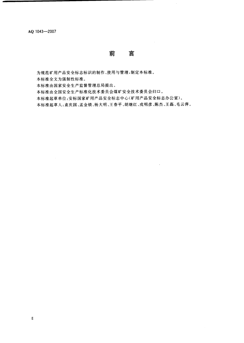 ICS13.10009备案号_19418-2007AQ中华人民共和国安全生产行业标准AQ1043-2007矿用产品安全标志标识MiningProductsSafetyLabel348072@abc5天前发布关注私信0.25MB8页037ICS13.10009备案号_19418-2007AQ中华人民共和国安全生产行业标准AQ1043-2007矿用产品安全标志标识MiningProductsSafetyLabel此内容为付费资源,请付费后查看¥19¥23黄金会员免费钻石会员免费立即购买您当前未登录!建议登陆后购买,可保存购买订单付费资源 第1页 / 共8页 第2页 / 共8页 第3页 / 共8页 试读已结束,还剩5页,您可下载完整版后进行离线阅读 THE END标准规范餐饮美食 文本预览 ICS13.100D09备案号:19418一2007AQ中华人民共和国安全生产行业标准AQ1043-2007矿用产品安全标志标识Mining Products Safety Label2007-01-04发布2007-04-01实施国家安全生产监督管理总局发布 查看更多 收起部分 喜欢就支持一下吧收藏