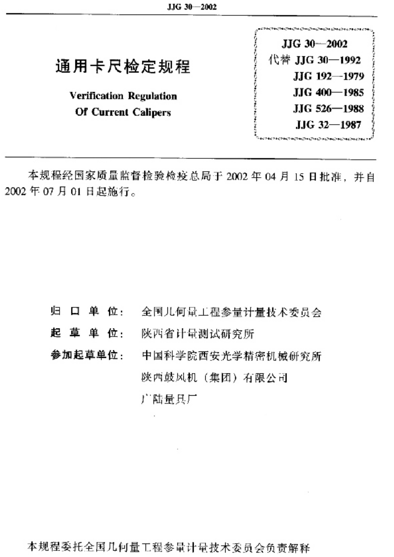 JJG302002通用卡尺CurrentCalipers_通用卡尺CurrentCalipers348072@abc9天前发布关注私信2.66MB15页045JJG302002通用卡尺CurrentCalipers_通用卡尺CurrentCalipers此内容为付费资源,请付费后查看¥19¥23黄金会员免费钻石会员免费立即购买您当前未登录!建议登陆后购买,可保存购买订单付费资源 第1页 / 共15页 第2页 / 共15页 第3页 / 共15页 试读已结束,还剩12页,您可下载完整版后进行离线阅读 THE END标准规范餐饮美食 文本预览 51编号:02空可可G中华人民共和国国家计量检定规程JJG30-2002通用卡尺Current Calipers2002-04-15发布2002-07-01实施国家质量监督检验检疫总局发布经 查看更多 收起部分 喜欢就支持一下吧收藏