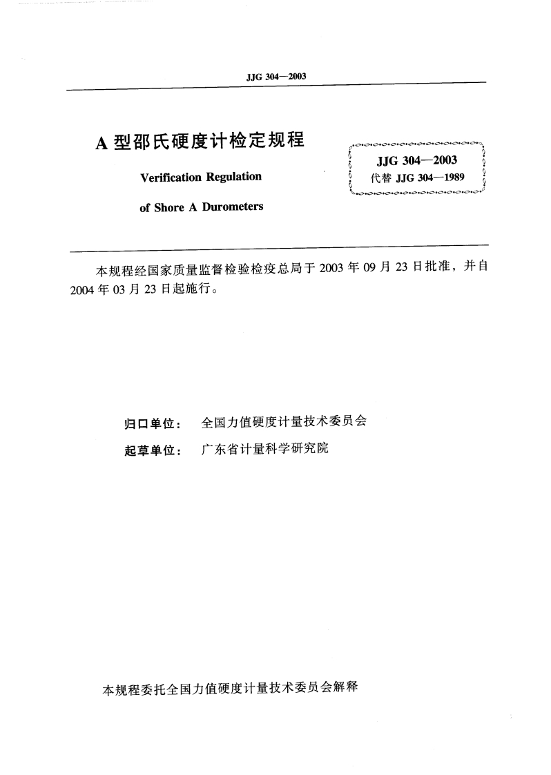 JJG304-2003A型邵氏硬度计ShoreADurometers_A型邵氏硬度计ShoreADurometers348072@abc9天前发布关注私信0.40MB12页026JJG304-2003A型邵氏硬度计ShoreADurometers_A型邵氏硬度计ShoreADurometers此内容为付费资源,请付费后查看¥19¥23黄金会员免费钻石会员免费立即购买您当前未登录!建议登陆后购买,可保存购买订单付费资源 第1页 / 共12页 第2页 / 共12页 第3页 / 共12页 试读已结束,还剩9页,您可下载完整版后进行离线阅读 THE END标准规范餐饮美食 文本预览 可G中华人民共和国国家计量检定规程JJG304一2003A型邵氏硬度计Shore A Durometers2003-09-23发布2004-03-23实施国家质量监督检验检疫总局发布 查看更多 收起部分 喜欢就支持一下吧收藏