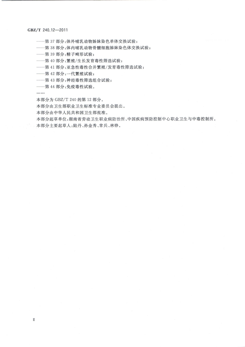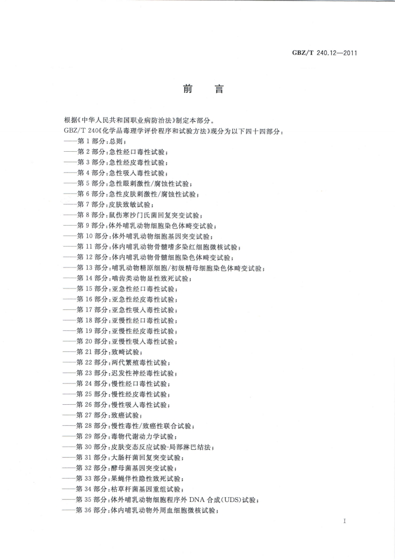 1CS13.100C52GBZ中华人民共和国国家职业卫生标准GBZ/T240.12-2011化学品毒理学评价程序和试验方法第12部分:体内哺乳动物骨髓细胞染色体畸变试验Procedures and tests for toxicological evaluations of chemicals-Part 12:In vivo mammalian bone marrow chromosome aberration test2011-08-19发布2012-03-01实施中华人民共和国卫生邵发布数码附伪