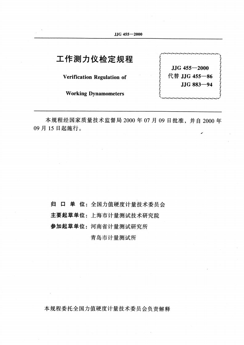 JJG455-2000工作测力仪WorkingDynamometers_工作测力仪WorkingDynamometers348072@abc9天前发布关注私信2.86MB15页032JJG455-2000工作测力仪WorkingDynamometers_工作测力仪WorkingDynamometers此内容为付费资源,请付费后查看¥19¥23黄金会员免费钻石会员免费立即购买您当前未登录!建议登陆后购买,可保存购买订单付费资源 第1页 / 共15页 第2页 / 共15页 第3页 / 共15页 试读已结束,还剩12页,您可下载完整版后进行离线阅读 THE END标准规范餐饮美食 文本预览 可G中华人民共和国国家计量检定规程JJG455-2000工作测力仪Working Dynamometers2000-07-09发布2000-09-15实施国家质量技术监督局发布 查看更多 收起部分 喜欢就支持一下吧收藏
