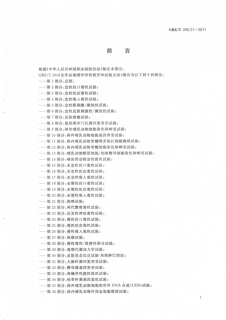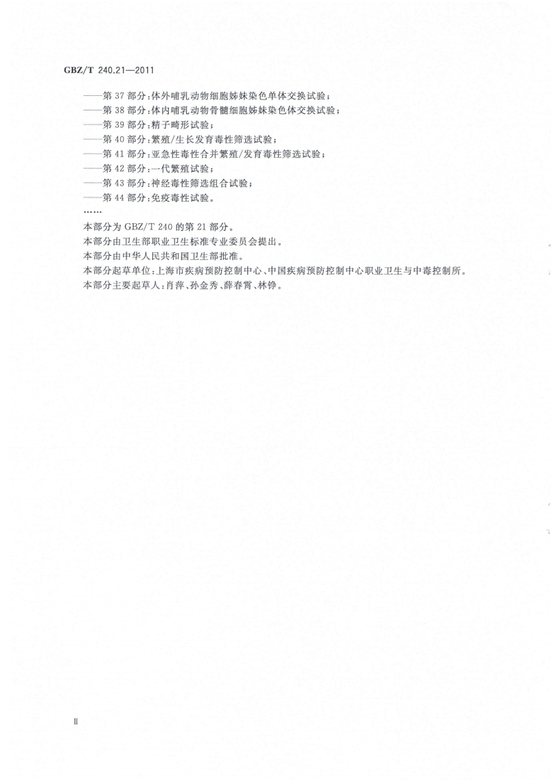 ICS13.100C526BZ中华人民共和国国家职业卫生标准GBZ_T240.21-2011化学品毒理学评价程序和试验方法第21部分_致畸试验348072@abc10天前发布关注私信4.18MB9页022ICS13.100C526BZ中华人民共和国国家职业卫生标准GBZ_T240.21-2011化学品毒理学评价程序和试验方法第21部分_致畸试验此内容为付费资源,请付费后查看¥19¥23黄金会员免费钻石会员免费立即购买您当前未登录!建议登陆后购买,可保存购买订单付费资源 第1页 / 共9页 第2页 / 共9页 第3页 / 共9页 试读已结束,还剩6页,您可下载完整版后进行离线阅读 THE END标准规范餐饮美食 文本预览 1CS13.100C52HBZ中华人民共和国国家职业卫生标准GBZ/T240.21-2011化学品毒理学评价程序和试验方法第21部分:致畸试验Procedures and tests for toxicological evaluations of chemicals-Part 21:Teratogenicity test2011-08-19发布2012-03-01实施中华人民共和国卫生邵发布数码防 查看更多 收起部分 喜欢就支持一下吧收藏