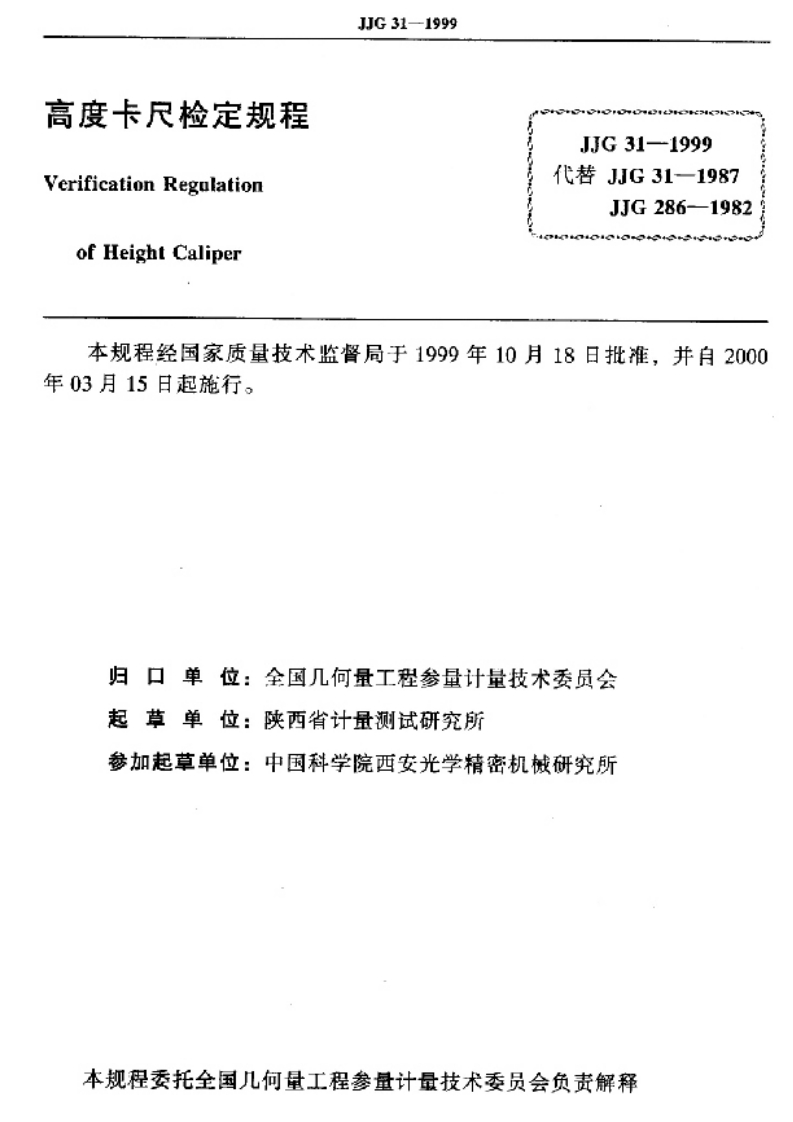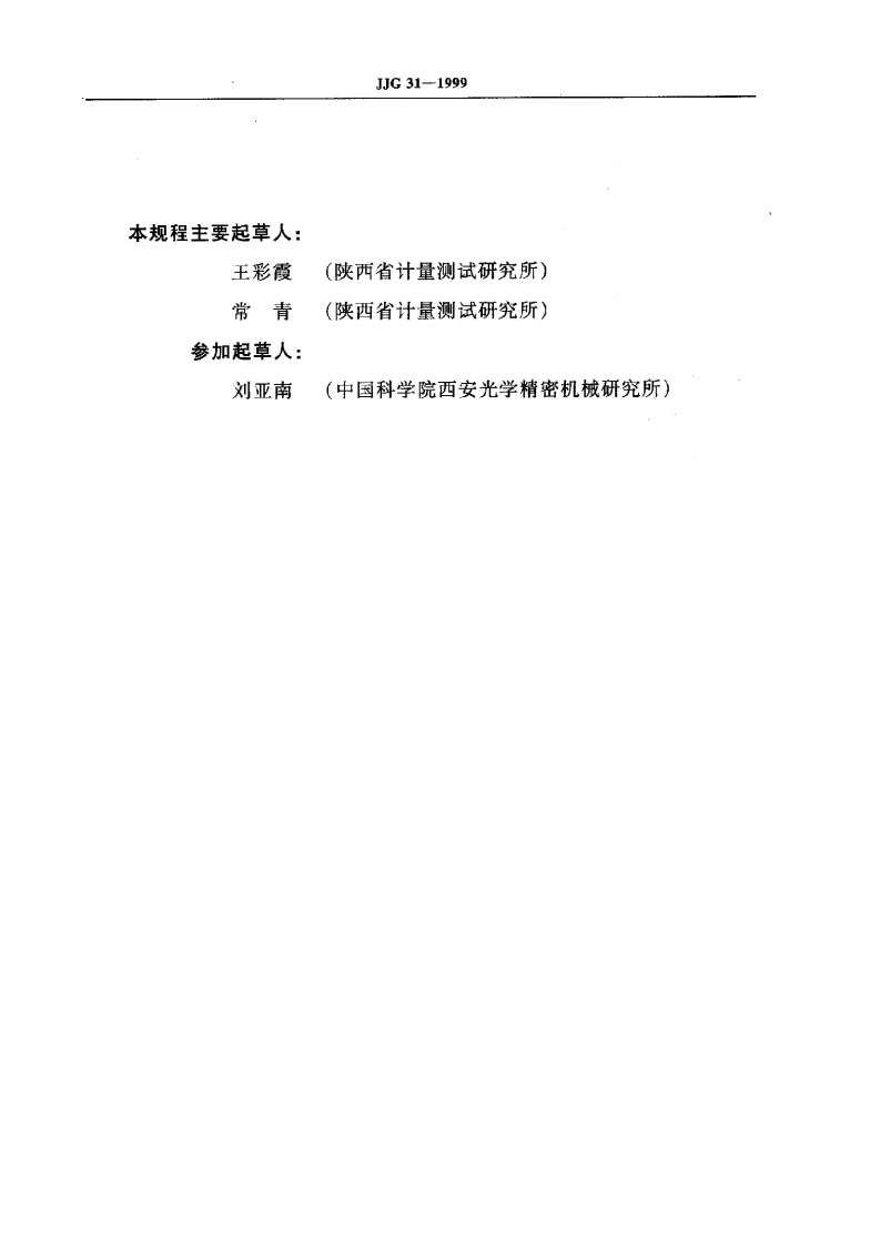 JTG31–1999高度卡尺HetghtCaliper_高度卡尺HetehtCaliper348072@abc10天前发布关注私信2.54MB15页022JTG31–1999高度卡尺HetghtCaliper_高度卡尺HetehtCaliper此内容为付费资源,请付费后查看¥19¥23黄金会员免费钻石会员免费立即购买您当前未登录!建议登陆后购买,可保存购买订单付费资源 第1页 / 共15页 第2页 / 共15页 第3页 / 共15页 试读已结束,还剩12页,您可下载完整版后进行离线阅读 THE END标准规范餐饮美食 文本预览 编号05J可G中华人民共和国国家计量检定规程JJG31-1999高度卡尺Height Caliper1999-1-18发布2000-03-15实施国家质量技术监督局发布 查看更多 收起部分 喜欢就支持一下吧收藏