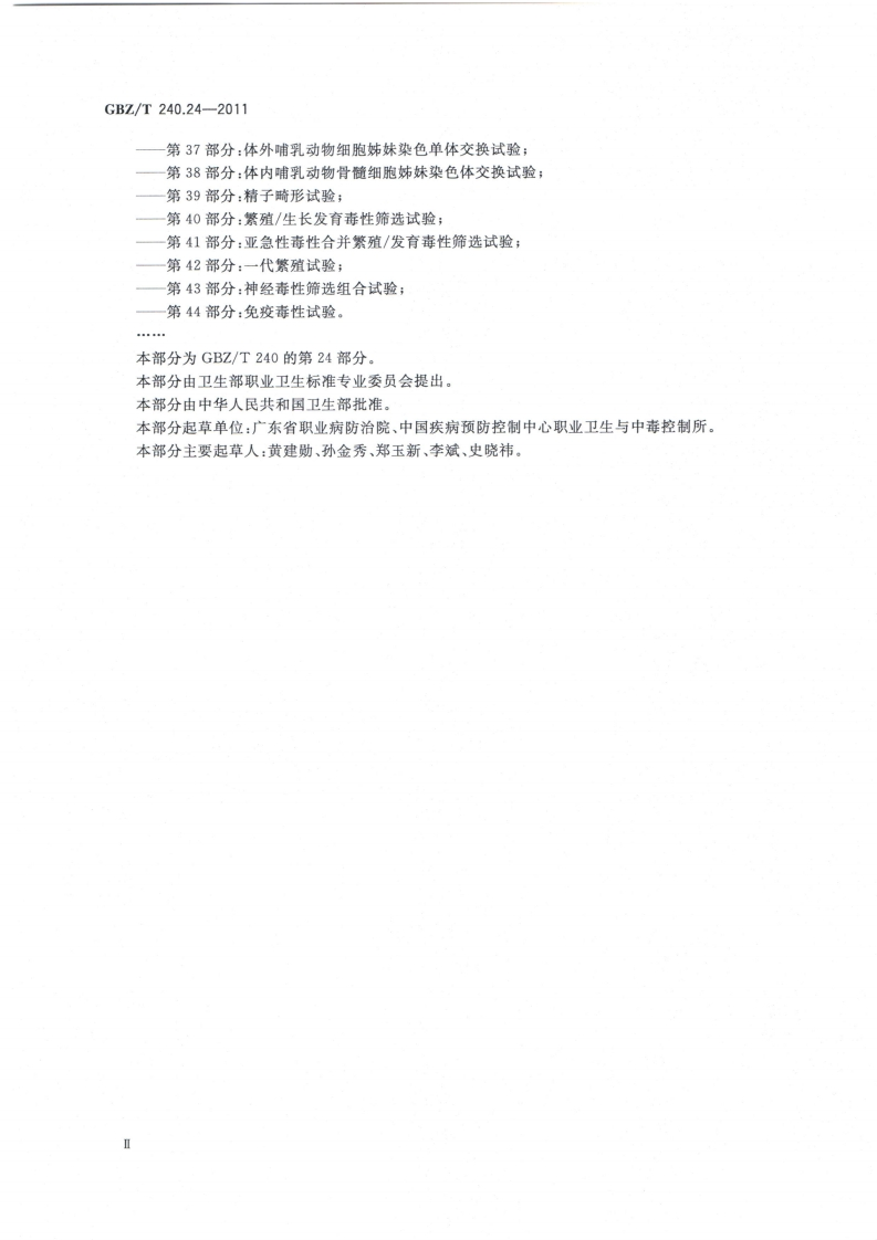 ICS13.100C52GBZ中华人民共和国国家职业卫生标准GBZ/T240.24-2011化学品毒理学评价程序和试验方法第24部分:慢性经口毒性试验Procedures and tests for toxicological evaluations of chemicals-Part 24:Chronic oral toxicity test2011-08-19发布2012-03-01实施数码防仍中华人民共和国卫生邵发布