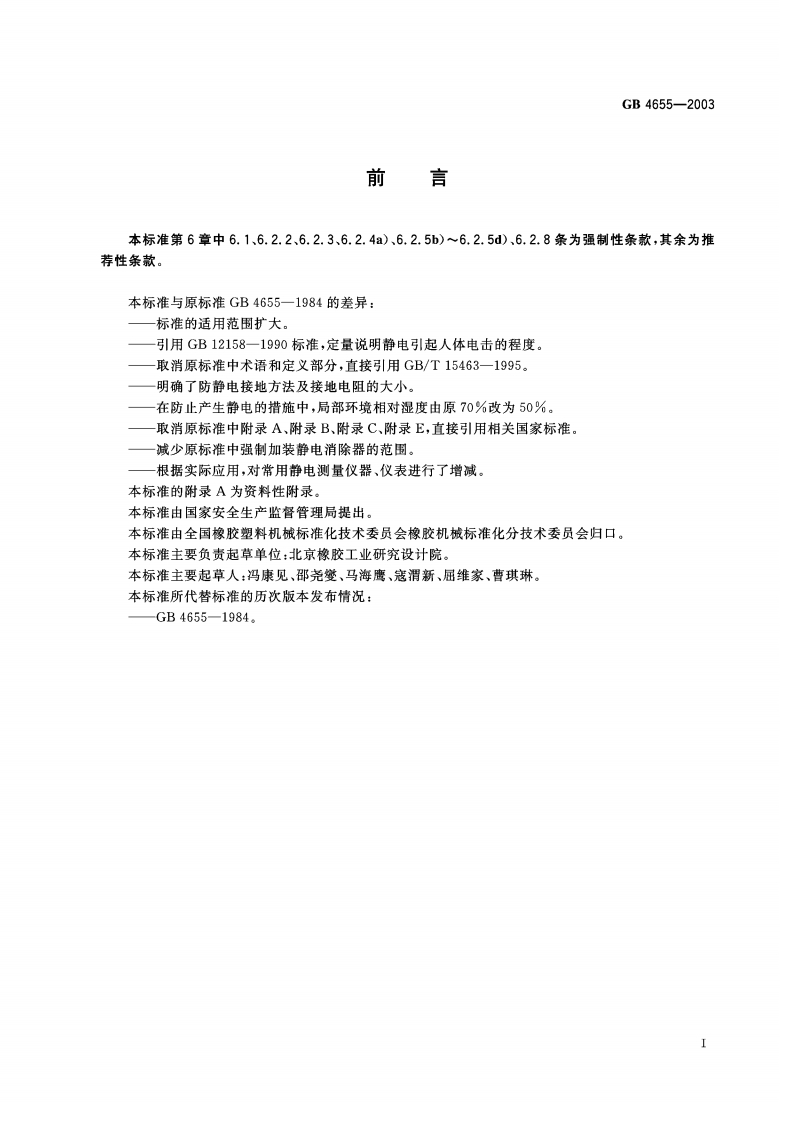 ICS13.100G09G3中华人民共和国国家标准GB4655-2003代巷GB4655-1984橡胶工业静电安全规程Safetyrulesofstaticelectricityintherubberindustry348072@abc3天前发布关注私信0.33MB9页035ICS13.100G09G3中华人民共和国国家标准GB4655-2003代巷GB4655-1984橡胶工业静电安全规程Safetyrulesofstaticelectricityintherubberindustry此内容为付费资源,请付费后查看¥19¥23黄金会员免费钻石会员免费立即购买您当前未登录!建议登陆后购买,可保存购买订单付费资源 第1页 / 共9页 第2页 / 共9页 第3页 / 共9页 试读已结束,还剩6页,您可下载完整版后进行离线阅读 THE END标准规范餐饮美食 文本预览 8g18.10o0B中华人民共和国国家标准GB4655-2003代替GB4655一1984橡胶工业静电安全规程Safety rules of static electricity in the rubber industry2003-09-12发布2004-05-01实施中华人民共和国国家质量监督检验检疫总局发布 查看更多 收起部分 喜欢就支持一下吧收藏