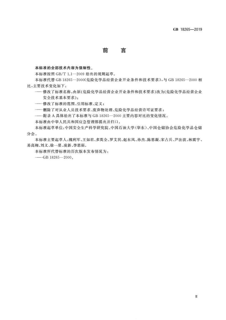 ICS13.200C65中华人民共和国国家标准GB18265-2019代巷GB18265-2000危险化学品经营企业安全技术基本要求Basicrequirementsofsafetytechnologyforenterpriseshandlinghazardouschemicalsbusiness348072@abc5天前发布关注私信1.27MB11页033ICS13.200C65中华人民共和国国家标准GB18265-2019代巷GB18265-2000危险化学品经营企业安全技术基本要求Basicrequirementsofsafetytechnologyforenterpriseshandlinghazardouschemicalsbusiness此内容为付费资源,请付费后查看¥19¥23黄金会员免费钻石会员免费立即购买您当前未登录!建议登陆后购买,可保存购买订单付费资源 第1页 / 共11页 第2页 / 共11页 第3页 / 共11页 试读已结束,还剩8页,您可下载完整版后进行离线阅读 THE END标准规范餐饮美食 文本预览 ICS13.200C65中华人民共和国国家标准GB18265-2019代替GB18265一2000危险化学品经营企业安全技术基本要求Basic requirements of safety technology forenterprises handling hazardous chemicals business2019-02-25发布2019-11-01实施国家市场监督管理总局中国国家标准化管理委员会发布 查看更多 收起部分 喜欢就支持一下吧收藏