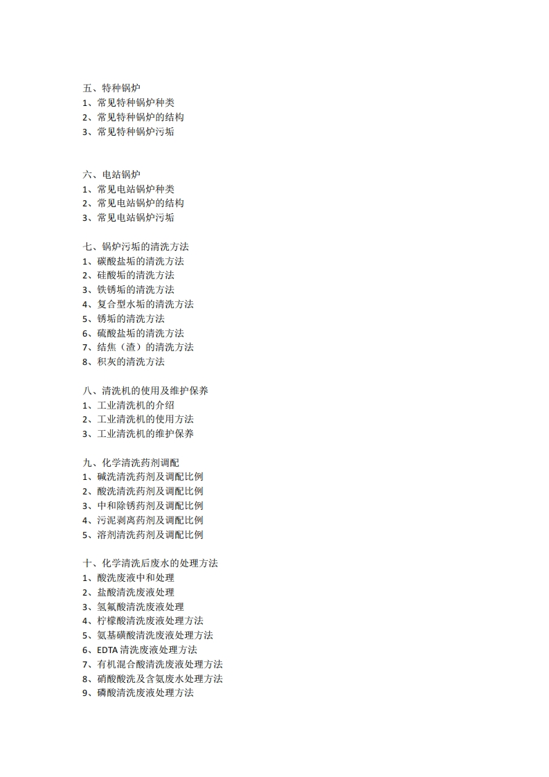 锅炉清洗技术培训培训依据:1.为了规范锅炉化学清洗工作,防止因化学清洗不当而危及锅炉安全运行,保证清洗工作人员安全根据《特种设备安全监察条例》及其有关安全技木规范制定本规则。2.本规则适用于《特种设备安全监察条例》所规定范围内的以水为介质的固定式承压锅炉(以下简称锅炉)在非运行状态下的化学清洗。培训内容:一、锅炉清洗安全培训1、国家安全生产方针、政策和有关安全生产的法律、法规、规章及标准2、安全生产管理基本知识、安全生产技术、安全生产专业知识3、重大危险源管理、重大事故防范、应急管理和救援组织以及事故调查处理的有关规定4、职业危害及其预防措施5、国内外先进的安全生产管理经验6、典型事故和应急救援案例分析二、锅炉的分类1、锅炉按用途分类2、锅炉按输出介质分类3、锅炉按燃料分类4、锅炉按压力分类三、常见10种锅炉的结构及特点1.立式横水管锅炉的结构2.立式横火管锅炉的结构3.立式直水管锅炉的结构4.立式弯水管锅炉的结构5.快装锅炉的结构6.双锅筒横置式水管锅炉的结构7.双锅筒纵式水管锅炉的结构8.单锅筒横置式直水管锅炉的结构9.单锅筒纵置式水管锅炉的结构10.排热水锅炉的结构四、常见锅炉污垢及形成原理1、碳酸盐垢及形成原理2、硅酸垢及形成原理3、铁锈垢及形成原理4、复合型水垢及形成原理5、锈垢及形成原理6、硫酸盐垢及形成原理